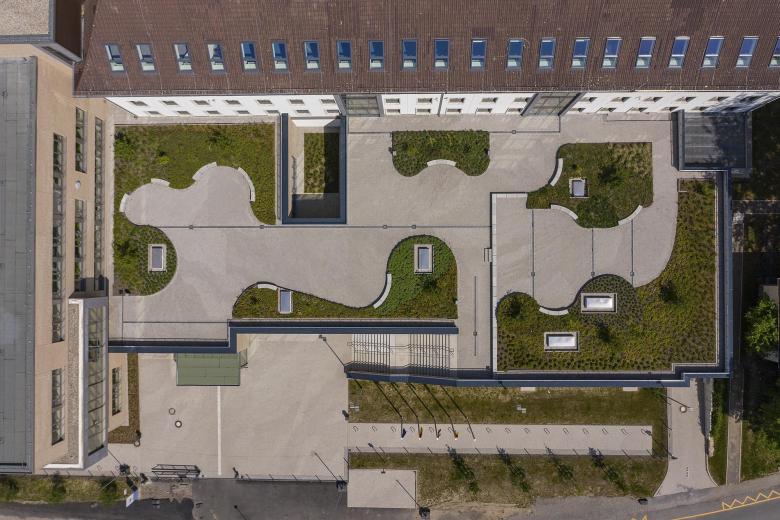 Das Foyer ist zusammen mit Pausenhalle und Aula in einem eingeschossigen Baukörper auf dem ehemaligen Vorplatz des Gebäudeensembles untergebracht, der außerdem zentraler Eingangsbereich ist. Der Baukörper bildet zusammen mit dem Verbindungstrakt das neue Gesicht der Schule. Auf dem Dach ist ein großzügiger, extensiv begrünter Aufenthaltsbereich konzipiert, den die Sekundarstufe ll als Schulhof nutzt. Zugunsten eines weiteren Schulhofs für die Sekundarstufe I wurde ein ehemaliger Parkplatz rückgebaut und über weite Teile mit Grünflächen versehen. Zahlreiche Spielmöglichkeiten dort sorgen für ausreichende Bewegungsfreiheit der Kinder.