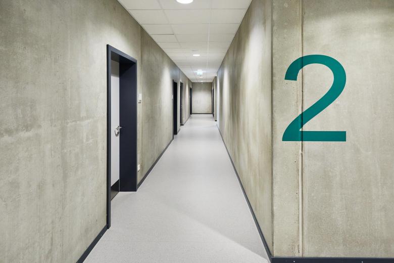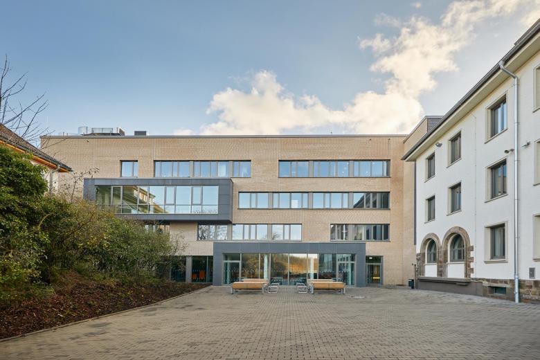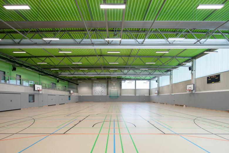 PASD plante den Verbindungstrakt mit großen Fenstern und einer Fassade aus sandfarbenem Klinker. Zusammen mit dem Foyer ist er das neue Herzstück der Schule. Er nimmt die städtebauliche Struktur der Bestandsgebäude von 1935 auf und fügt sich hervorragend in das Gesamtensemble ein. Mit seiner gradlinigen, modernen Architektur fällt der Verbindungsbau gleichzeitig auf. Kopfbauten ergänzen das Gesamtensemble städtebaulich und markieren wichtige Eckpunkte nach Norden und nach Süden. Dazu gehört am nordöstlichen Abschluss des Campus auch der Neubau der Turnhalle.