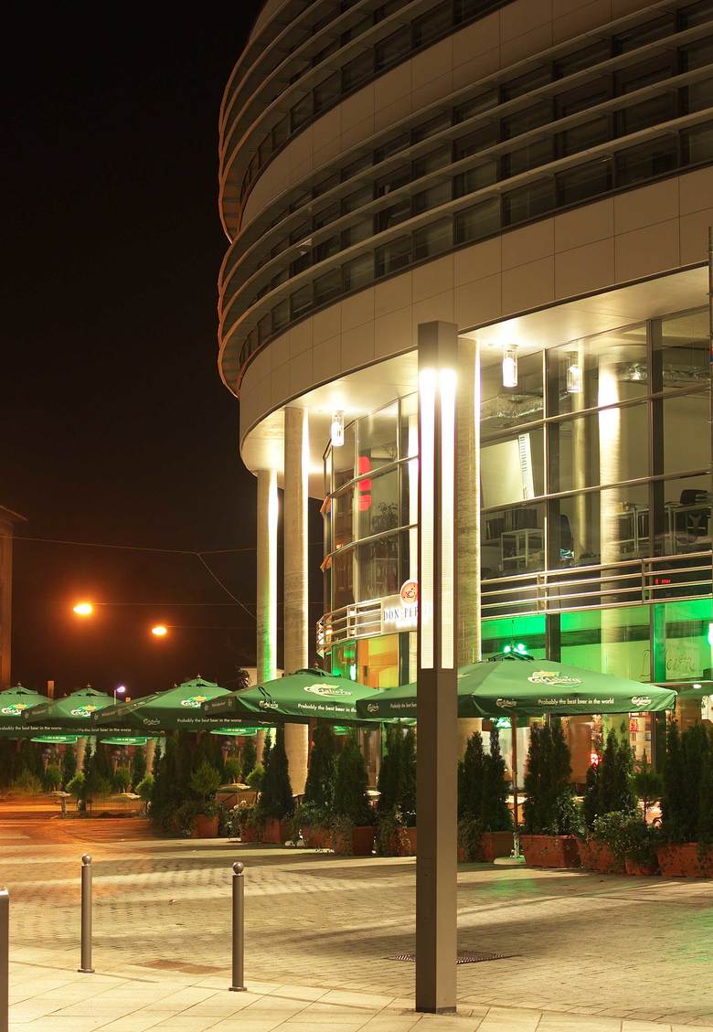 Während die Fassade der Rundseiten im Bereich des Einzelhandels zugunsten einer zweigeschossigen Arkade zurückspringt, verläuft die Fassade in den Bürogeschossen in wechselweise massiven und verglasten Bändern. Zusätzlich angeordnete Sonnenschutzlamellen dienen der Verschattung und unterstreichen zudem die Gebäudeform.