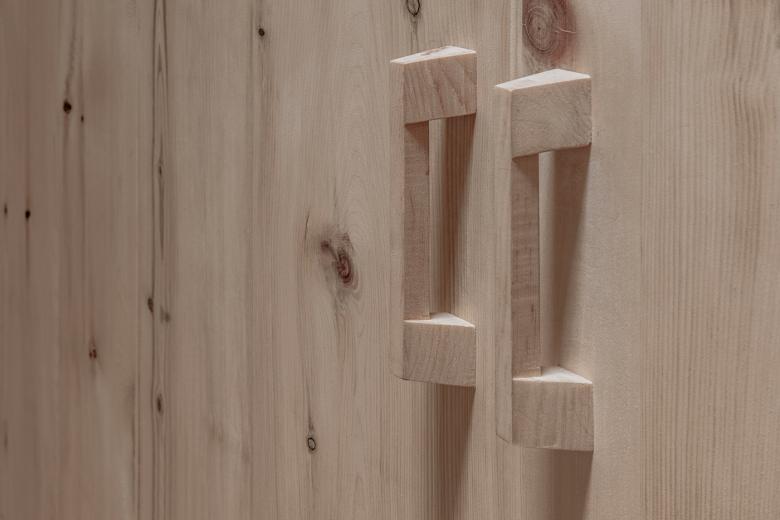 Die drei oberirdischen Geschosse sind vollständig aus dem Holz gefertigt, das am 30. Oktober 2018 während heftiger Unwetter in den umliegenden Wäldern fiel. Sowohl die Außen-, als auch die Innenwände bestehen aus massivem Fichtenholz und wurden durch eine spezielle Technik ohne Verwendung von Klebern und Harzen gefügt. Die 6cm starken Holzdielen wurden hierfür zu 36cm starken Außenwänden verbunden und auch innerhalb der Bauteile immer so verbaut, wie der Baum gewachsen war – von unten nach oben. Die innere Schicht besteht aus massivem Zirbelholz, die Oberflächen wurden handgehobelt. Alle Wände wurden bereits mit dieser Oberfläche vorgefertigt; die Anschlüsse für Fenster und Türen wurden in die Wandelemente eingefalzt. Wegen ihres warmen Farbtons und des charakteristischen Geruchs, der dem Raum Wohlgefühl und Wärme verleiht, wird die Zirbe in der lokalen Tradition bereits seit Jahrhunderten für die Innenverkleidung der Stube verwendet.