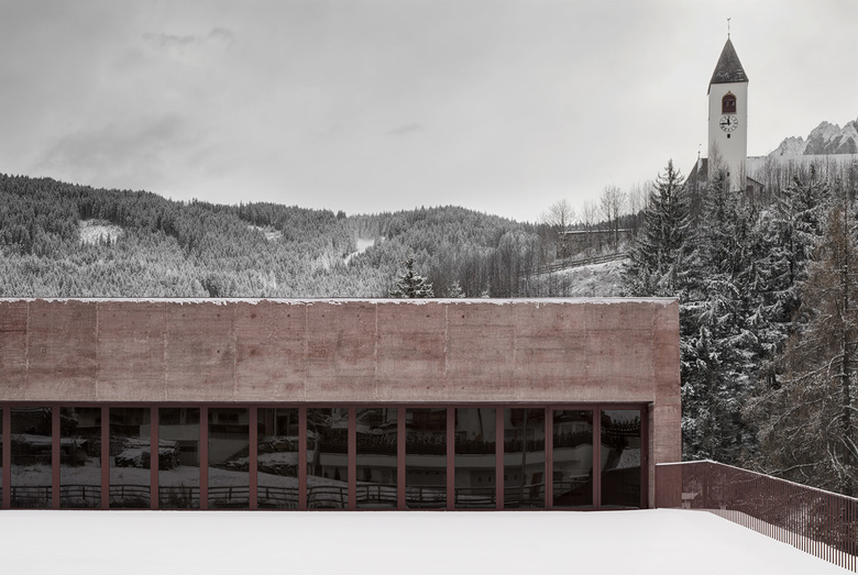 Als Kontrast zum massiven Beton wurde für den "Saal", der auch Treffpunkt für die Einwohner von Vierschach ist, Zirbenholz und heimischer Loden eingesetzt.