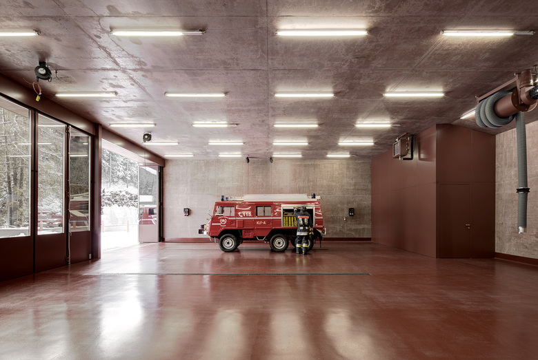 Auszug aus dem Wettbewerbsprotokoll: "Das Projekt besticht durch den klaren, kompakten Baukörper. Die rote Farbgebung ist Zeichen für die Funktion und unterstreicht die Eigenständigkeit des neuen Gebäudes. Selbstverständlich nimmt der schmale Riegel die vorhandene Bebauung auf und bindet mit den bis an die Strasse geführten Stirnseiten selbstbewusst an den Ort an. So entstehen ein oberer Platz und ein unterer Platz, auf den jeweils folgerichtig die oberen (Saal) bzw. unteren Räume (Fahrzeughalle) ausgerichtet sind.