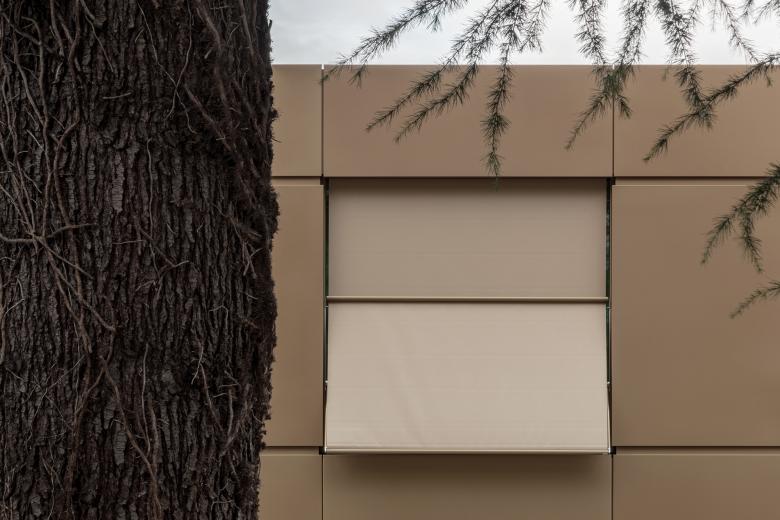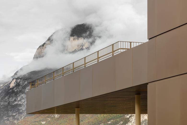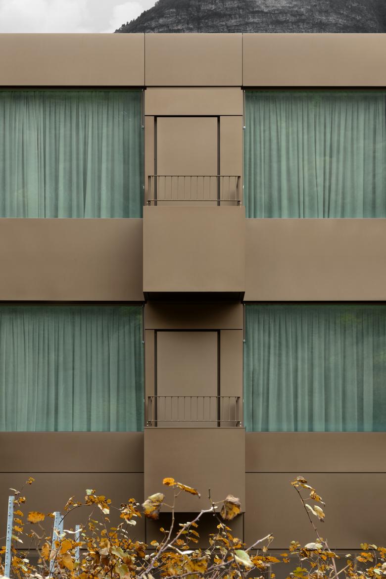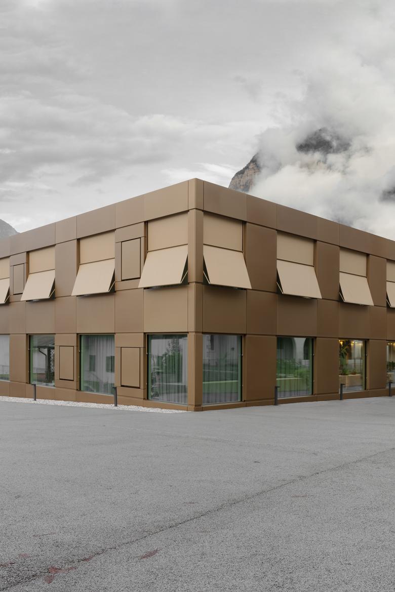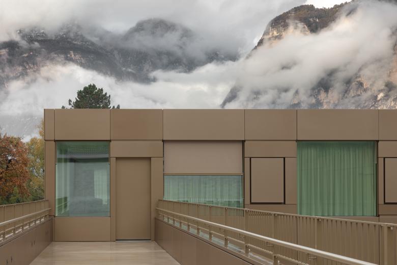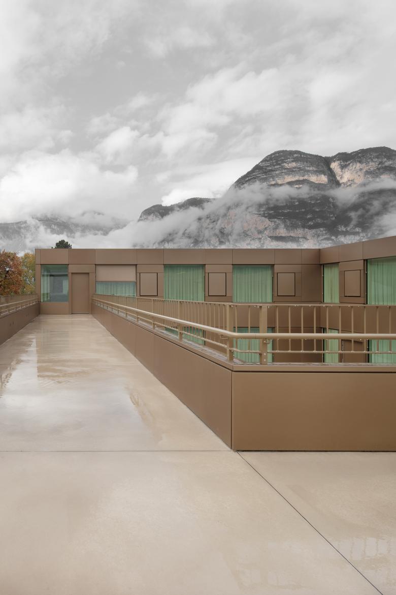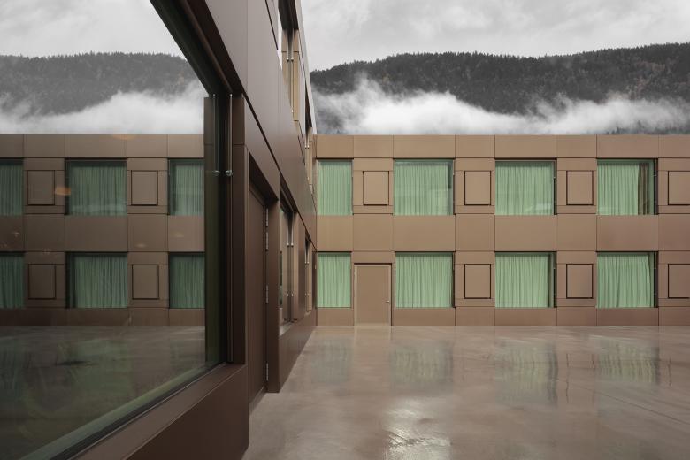 Die Farbgebung der eloxierten Metallfassade ist eine Reminiszenz an die umgebende Bebauung, deren sandfarbige Architekturen seit jeher nicht den Ausdruck Tiroler Alpentäler suchen, sondern vielmehr der Weinstraße eine farbliche Entsprechung verleihen, ein Gefühl des Südens und der Wärme. In den großen, niedrig gesetzten Öffnungen des Hauses spiegeln sich die ehrwürdigen Nachbarn, Ansitze und Berge. Ausblicke von Innen sind währenddessen auch im Sitzen und Liegen möglich. Die alters- und bedarfsgerechte Architektur bietet neben großen und kommunikativen Gemeinschaftsbereichen zudem individuelle Rückzugsorte an. Ziel war es, eine angenehme Wohnatmosphäre mit hellen, behaglichen Räumen zu schaffen – eine Architektur, die das Lebensgefühl des Ortes einfängt und auch das Pflegeheim zu einem Zuhause werden lässt.
