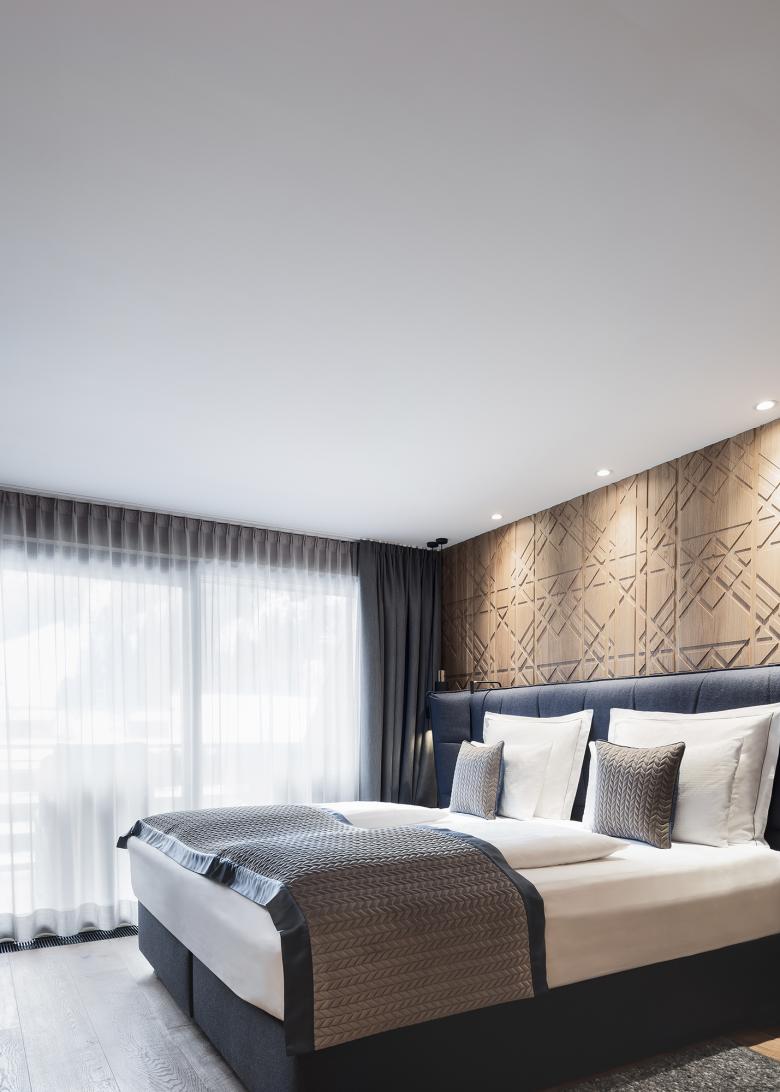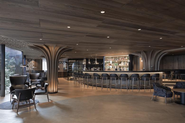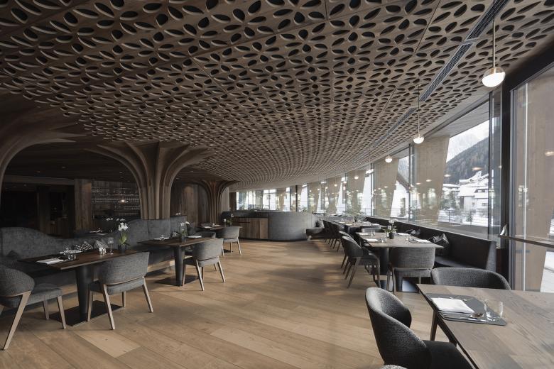 The existing balconies and wooden cladding, the roof and a glass conservatory were demolished and replaced. In terms of urban planning, the connection between the main building and the downhill extension is created by an elegantly curved, single-storey structure, which houses the reception area, bar, lounge, dining room and the new gourmet area. With its storey-high glazing and the characteristic wooden cladding of the attic, the extension becomes the new architectural hallmark of the entire Hotel Granbaita. Its upgrading to a 5-star hotel reflects not only the simple, elegant façade made of dark larch wood, but also the high-quality materials that were used for the architecturally timeless interior design, such as smoked oak wood, grey natural stones and local fabrics that establish colour accents. The harmonious design concept creates an atmosphere that is continued not only in the technically state-of-the-art refurbished wellness area, but also in the 35 luxurious rooms and suites, which were also redesigned as part of the restructuring.