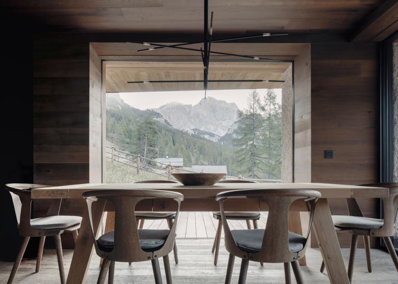 Adhering to the A Nature climate house standard, the new construction not only excels in energy efficiency but also champions sustainability by employing indigenous building materials. The concrete walls, enriched with an aggregate of white dolomite rock, received meticulous on-site treatment, imparting them with a unique surface texture. Both the façade's wooden cladding and the roof's shingles showcase the use of natural South Tyrolean larch wood. In the interiors, whose detailed design was also planned by Perathoner Architects, the wall panelling and floors made of local oak create a cosy ambience.