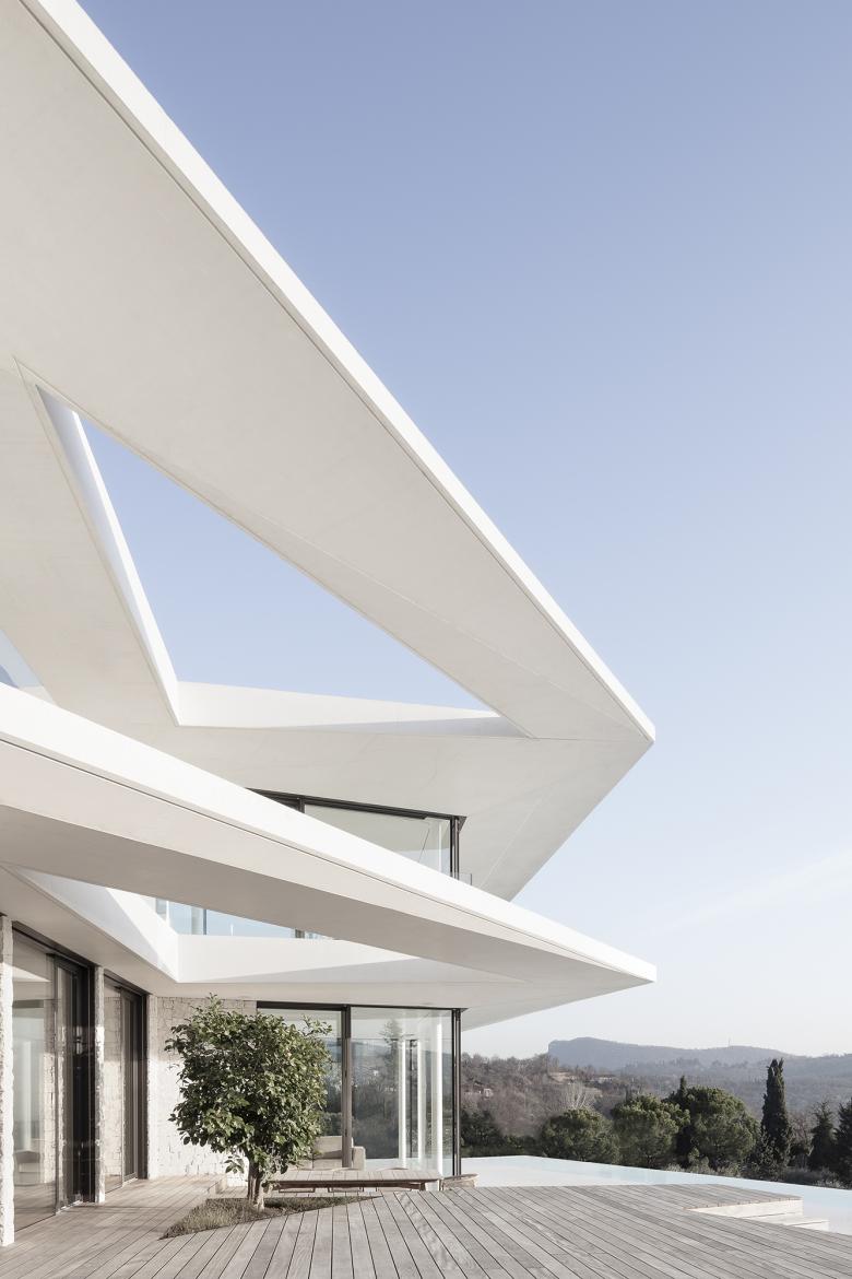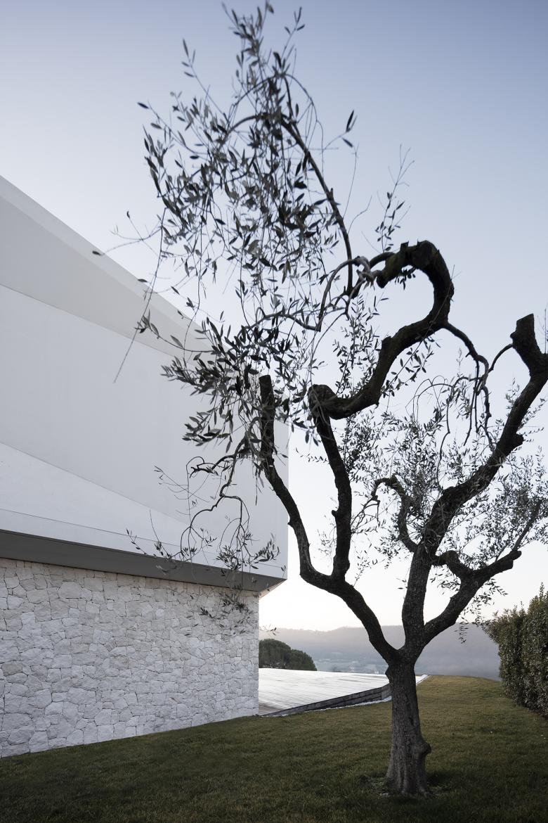 The combination of consequent reduction of the design language and the thoughtful use of the building materials utilized creates a contemporary, minimalist architecture that is strongly inspired by the rationalism of the early 20th century, without ignoring its structural context. The ground floor clad with local natural stone forms the base for the cantilevered upper floor, made of exposed concrete with white cement and aggregates made of Carrara marble and shuttered on site with millimetric precision.