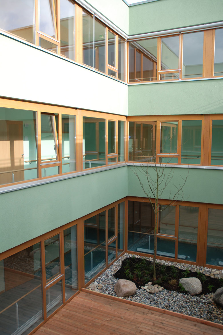 Zwischen den beiden Baukörpern befindet sich ein Hof, der den Bewohnern zur Erholung dient oder auch für festliche Anlässe genutzt werden kann.