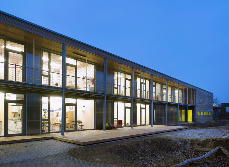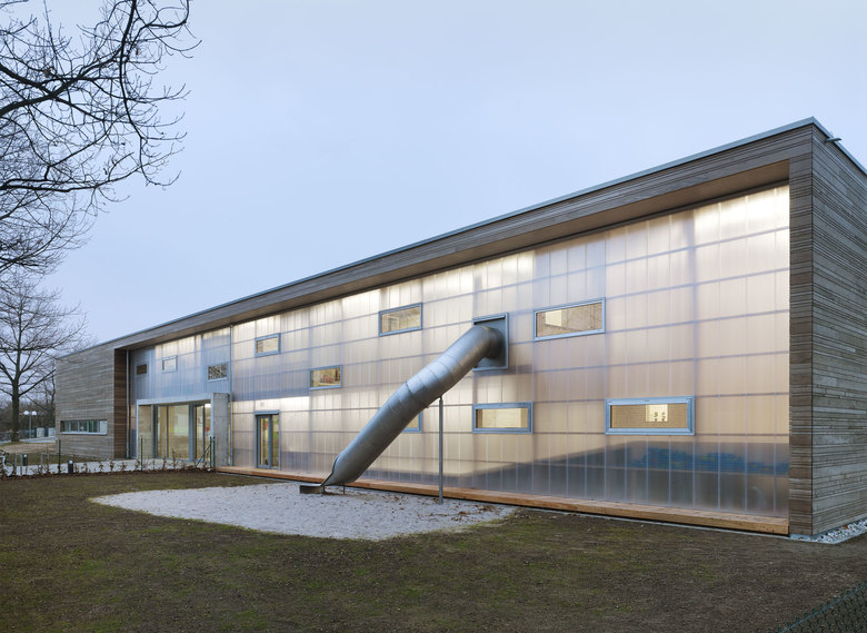 Konzept – "Ein Gebäude wie eine kleine Landschaft - eine Raumlandschaft" könnte man den Entwurfsansatz im Inneren des Gebäudes beschreiben. Schräge Wände, Rampen, Mulden, Treppen und Plätze spiegeln die Interessen der Betreiber und die mögliche Interaktion der Kinder wieder: bewegen und entdecken - verstecken und treffen - ruhige, fast meditative Raumkompostion und die Dynamik des Sports.