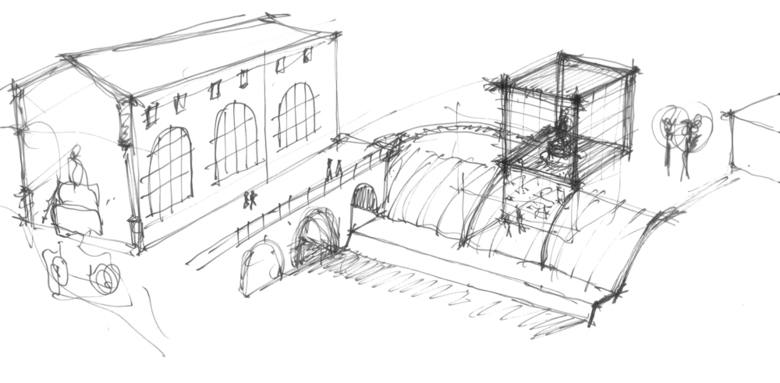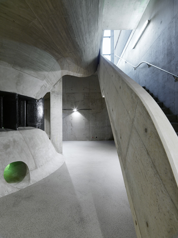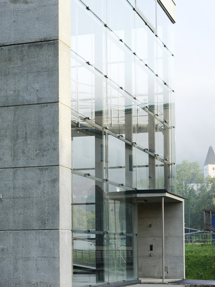An der Böschungskante sitzend nimmt es eine selbstbewusste aber respektvolle Position zum Kraftwerk ein und steht als Beispiel zeitgemäßer Baukunst in spannungsvollem architektonischen Dialog zum historischen Krafthaus.