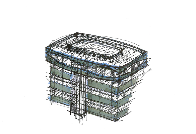 Der Entwurf der Aufstockung mit einem im Grundriss leicht geschwungenen Baukörper und einem umlaufenden Fensterband, welches in den Glashöhen gekonnt variiert, vermittelt Eleganz und Dynamik. Es krönt das bestehende einfache, funktionelle und kubische Betriebsgebäude auf architektonische Weise.