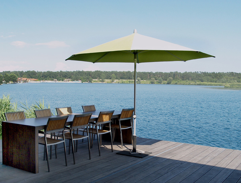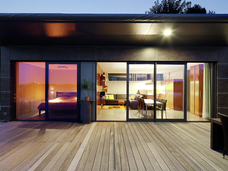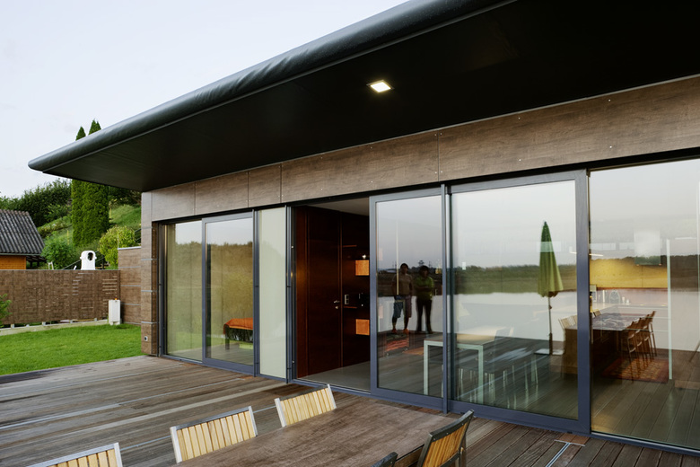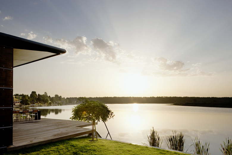 Uferseitig lässt sich der neun Meter lange Bau dank raumhoher gläserner Schiebetüren komplett öffnen wodurch ein fließender Übergang zwischen Schlaf-, Koch- und Wohnbereich und sowie Sonnendeck entsteht. So ergibt sich ein insgesamt fast 100 Quadratmeter großer “Wohnraum”.