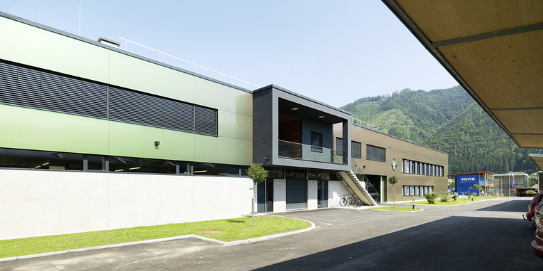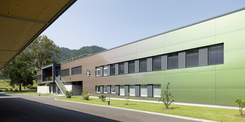 Das lang gestreckte Gebäude mit seiner je nach Lichteinfall zwischen hellgrün und rotbraun changierenden Fassade nimmt eine selbstbewusste, moderne Position neben dem dominanten Krafthaus ein.