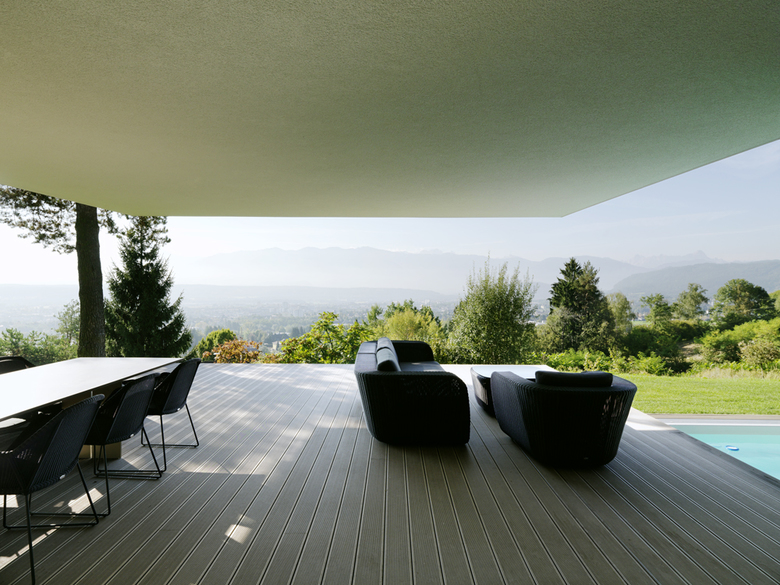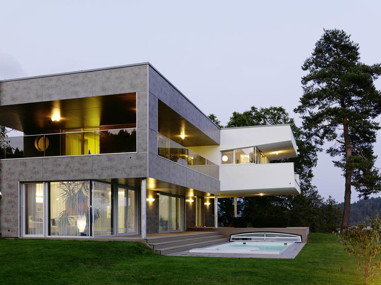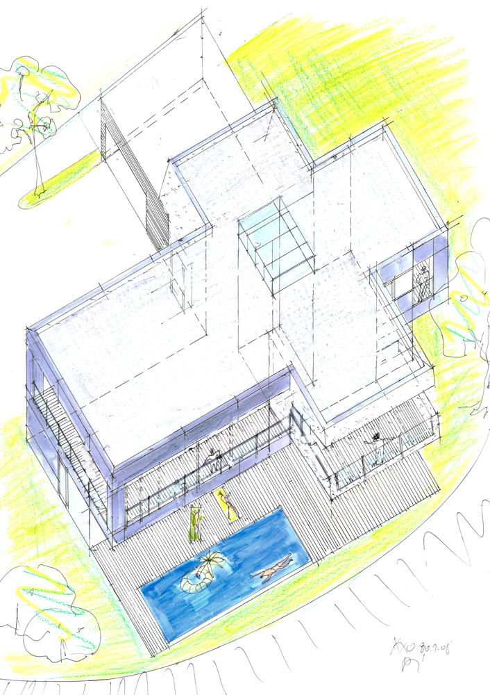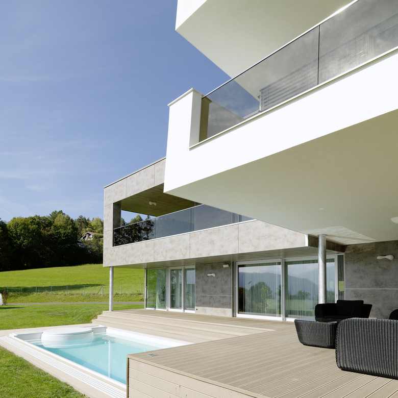 Gegen Norden eher geschlossen öffnen sich die Wohnräume nach Süden und Westen über große Glasfassaden zu den Freiflächen und dem leicht abgesenkten Pool.