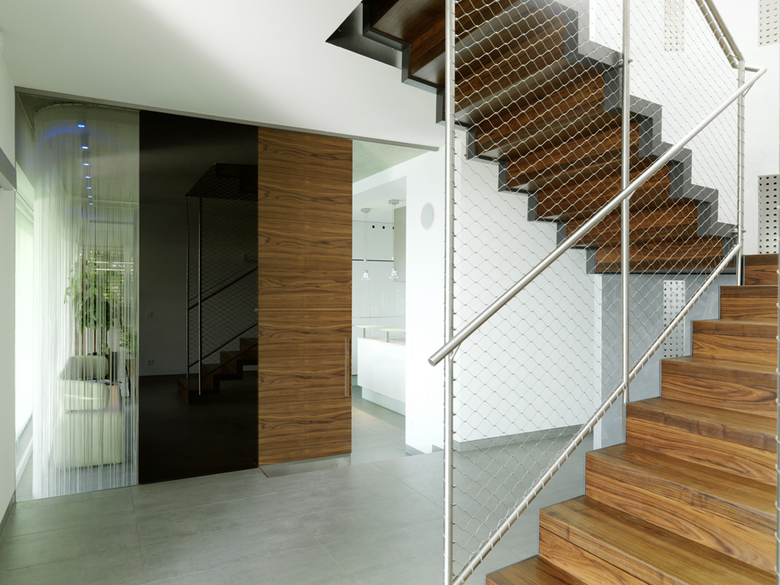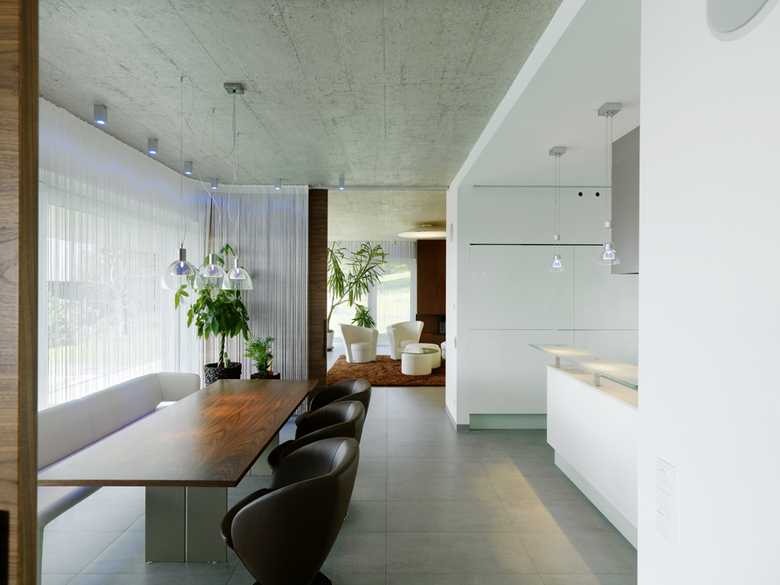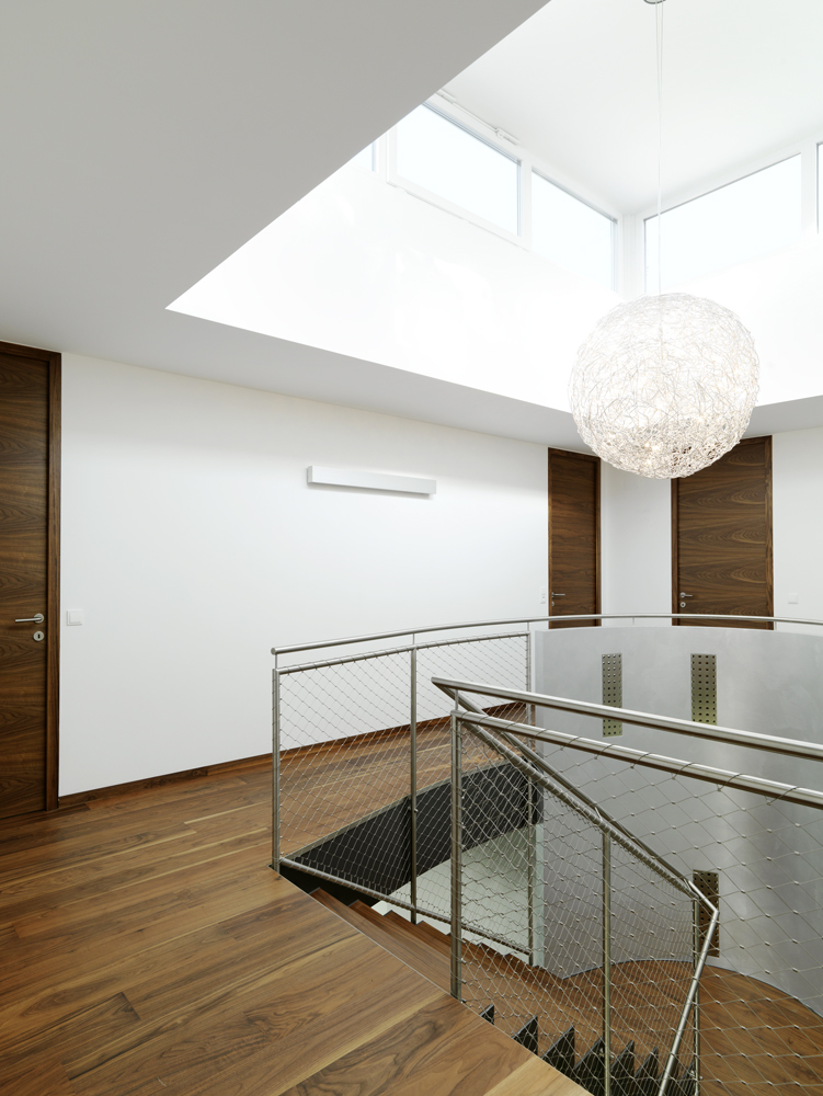 Die Innenausstattung und Möblierung wurde gemeinsam mit dem Bauherren entwickelt und bilden mit dem Gebäude ein formales Gesamtkonzept. Hochwertige Oberflächen wie Landhausdielen und raumhohe Türelemente aus Nussholz oder großformatige keramische Platten stehen im Kontrast zur geschliffenen Stahlbetondecke.