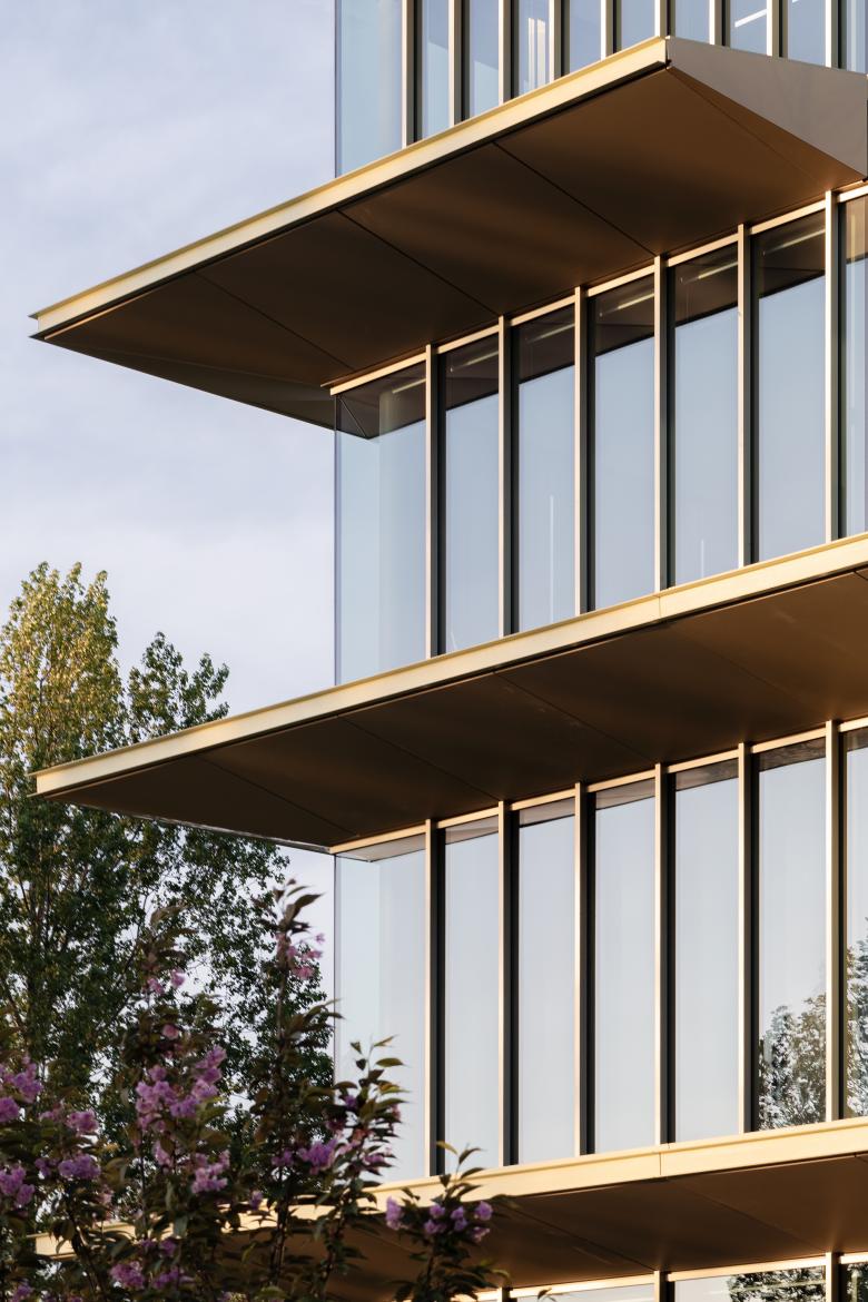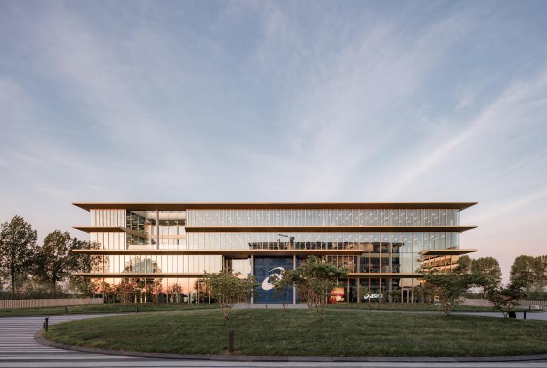 From the outside, the building is characterized by an elegant geometric clarity. The full-perimeter overhangs, whose main function is sheltering the workspace from direct sunlight, create the distinctive horizontality of the facade. The entrance of the building, consisting of an oversized, ASICS-branded custom-manufactured blue glass wall, is highlighted by a deep recess in the main facade. The presence of a double-height transparency on one side and a recess with a green terrace on the other breaks the symmetrical composition of the simple horizontal overhangs and central position of the entrance.