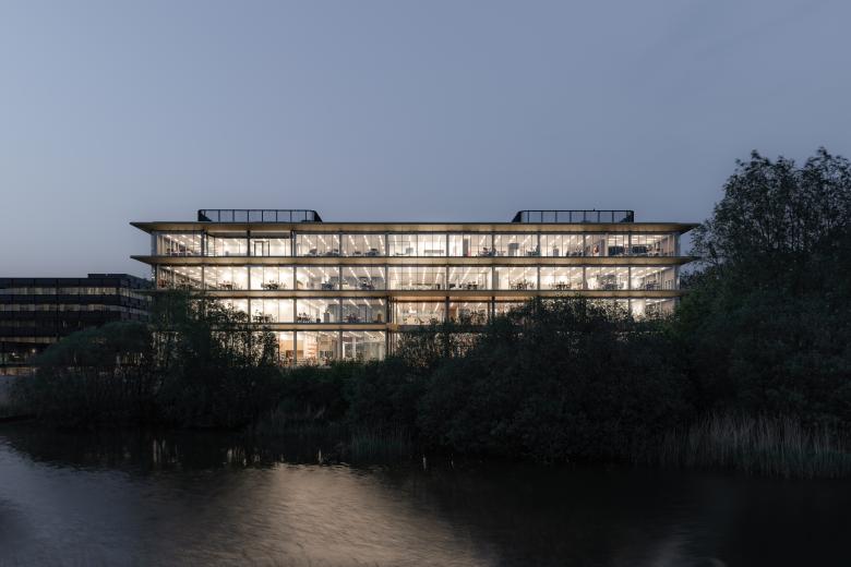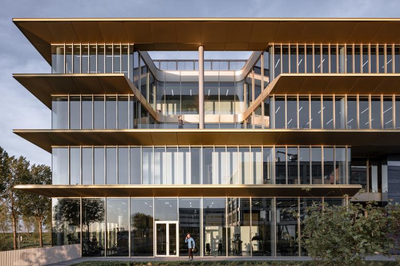 Powerhouse Company's future-proof design features an efficient and flexible layout to optimally support various types of work, geared towards innovation and collaboration. With floor-to-ceiling glass windows, each level is flooded with natural light and offers panoramic views of the Defence Line of Amsterdam that has been enlisted on the UNESCO World heritage list since 1996. The building’s full glass facade is complemented by sleek cantilevering roofs, creating a unique silhouette. On each floor, parts of the facade fold inwards to create terraces, giving direct access to outdoor spaces.