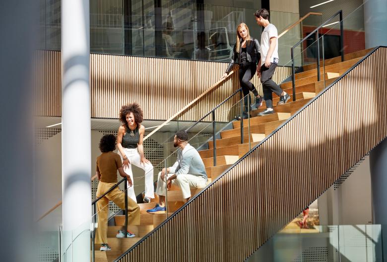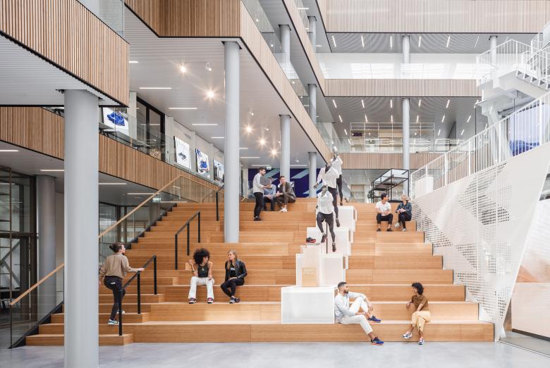 Catered specifically to ASICS' unique philosophy of ‘A Sound Mind in a Sound Body’, the building was constructed according to the latest standards in health and sustainability, as defined by the WELL Gold and LEED Gold certifications. The design team created a building that is not only beneficial for its surroundings by saving energy, water and reducing CO2 emissions, but also ensures the wellbeing of its employees by focusing on a healthy interior climate and a comfortable, diverse work environment. Due to the strategic positioning of the staircases close to the atrium, users of the building will also be inspired to take the stairs instead of the elevators. This design feature was implemented to stimulate physical activity.