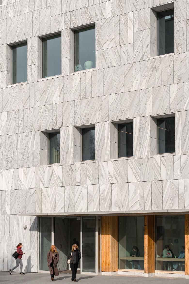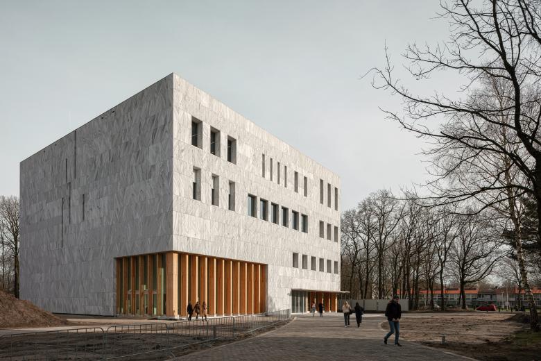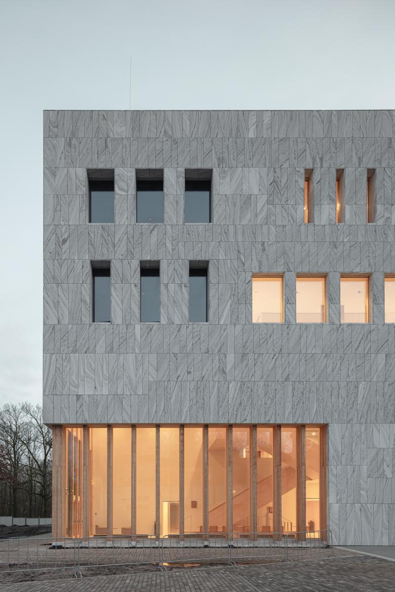 The design of the Marga Klompé Building seamlessly integrates with the modernist architecture of the Tilburg University campus. Its circular ambitions are reflected in the renewable nature of its wooden construction, walls, floors, stairs, frames, and finishes. A unique dry construction system has been implemented, utilizing wooden ribbed floors—CTL floors reinforced with beams—that enable large free spans meeting the high acoustic requirements necessary for the program. The Portuguese natural stone facade, featuring deep reveals, directly references the iconic 1962 Cobbenhagen Building by Jos Bedaux. The natural stone, with its long lifespan and ability to be disassembled, confirms the circular ambitions. The stony volume harmonizes with the surrounding architecture, forming an intriguing contrast with the lush, wooded environment. The all-encompassing building is integrated into the campus and marks the entrance from the station.