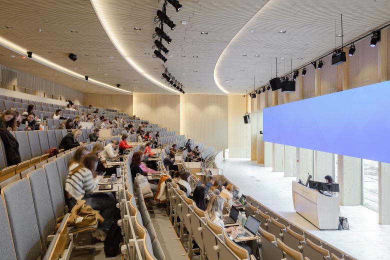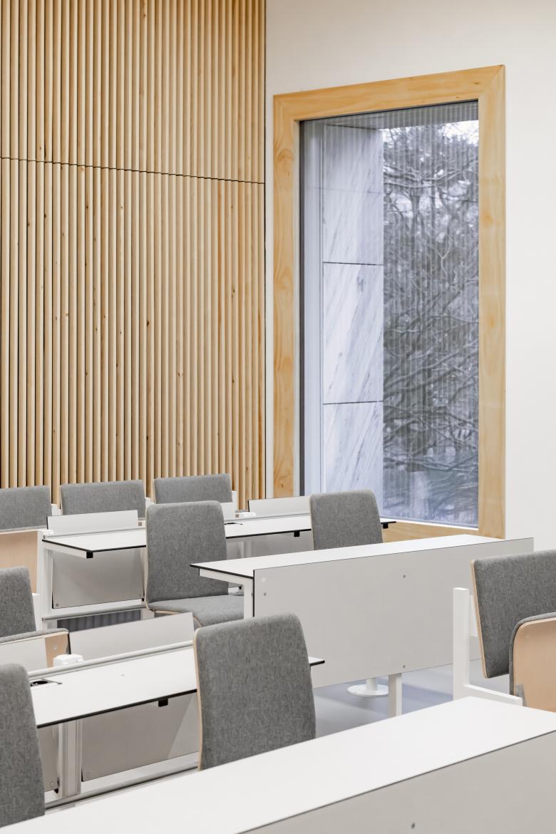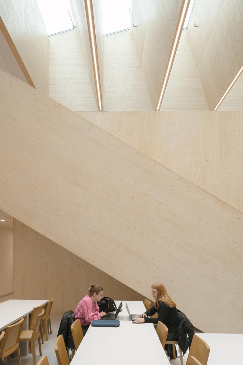 Powerhouse Company took the Cobbenhagen Building as a starting point for spatial qualities but brought the design into the 21st century by opting for a palette of natural, circular materials such as wood, terrazzo, and plasterwork. These materials are prominently featured and contribute to a serene atmosphere, from the spacious lecture halls to the intimate alcoves by the windows. Additionally, wooden furniture has been used to enhance the tranquil study spaces.