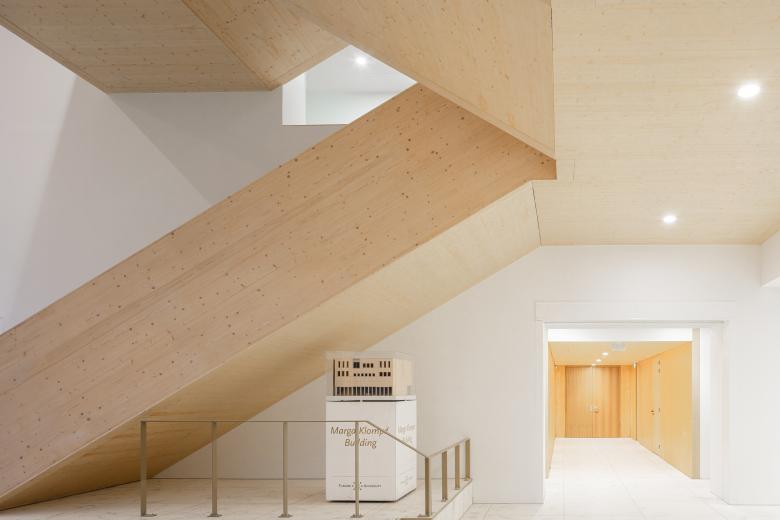 Marga Klompé Building, designed by Powerhouse Company, is the first college building in Europe to be entirely constructed from solid wood. The new, nearly energy-neutral complex is situated on a plot of land measuring 33 by 33 meters, within the forested campus of Tilburg University. The building accommodates a foyer, 1 auditorium, 13 lecture halls, and self-study spaces for approximately 1,000 students. Its distinctive architecture pays homage to the monumental Cobbenhagen Building on the campus while also serving as a model for the highly sustainable ambitions of university campuses in Europe.