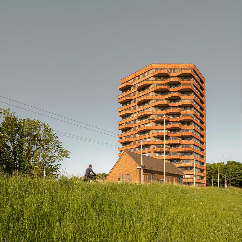 The façade is crafted from bricks made with clay drawn directly from the nearby riverbanks, rooting the building in the landscape and deepening its local identity. Its color palette harmonizes effortlessly with the neighboring structures, reinforcing the visual rhythm of the buildings across the floodplains. Yet, amid this harmony, bold accents in warm, glowing tones catch the light – subtle but striking touches that give NELSON its own unmistakable presence.
