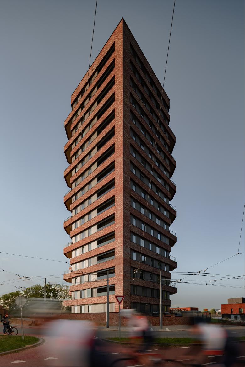 Just a short distance from the center of Arnhem, on the banks of the Rhine, residential tower NELSON has been completed. Designed by Powerhouse Company for VanWonen, the diamond-shaped building completes a series of buildings along the floodplains, arranged like a subtle ‘string of pearls’ across the dike landscape. With its striking form and prominent sightlines, NELSON serves as a visual landmark, anchoring the view and defining its place in the city’s silhouette.