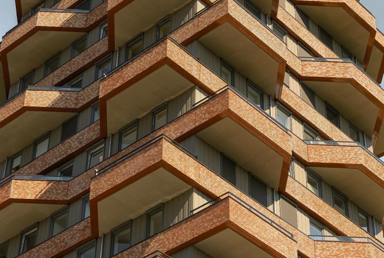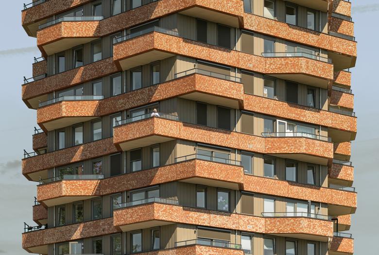 The dynamic shift in balconies is possible by varying the floorplans. This flexibility is created by having a diamond-shaped structural core that mirrors the load bearing façade. The layout is designed to remain flexible, as everything between the core and the façade can be reconfigured, should future demand arise. Adaptability is thus a key part of the design, while always maintaining high- quality floorplans with balconies connected to the living spaces. Comprising 93 units, the apartment configuration varies per floor from affordable housing on the lower levels to open plan penthouses at the top.