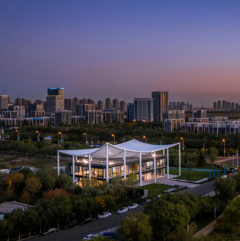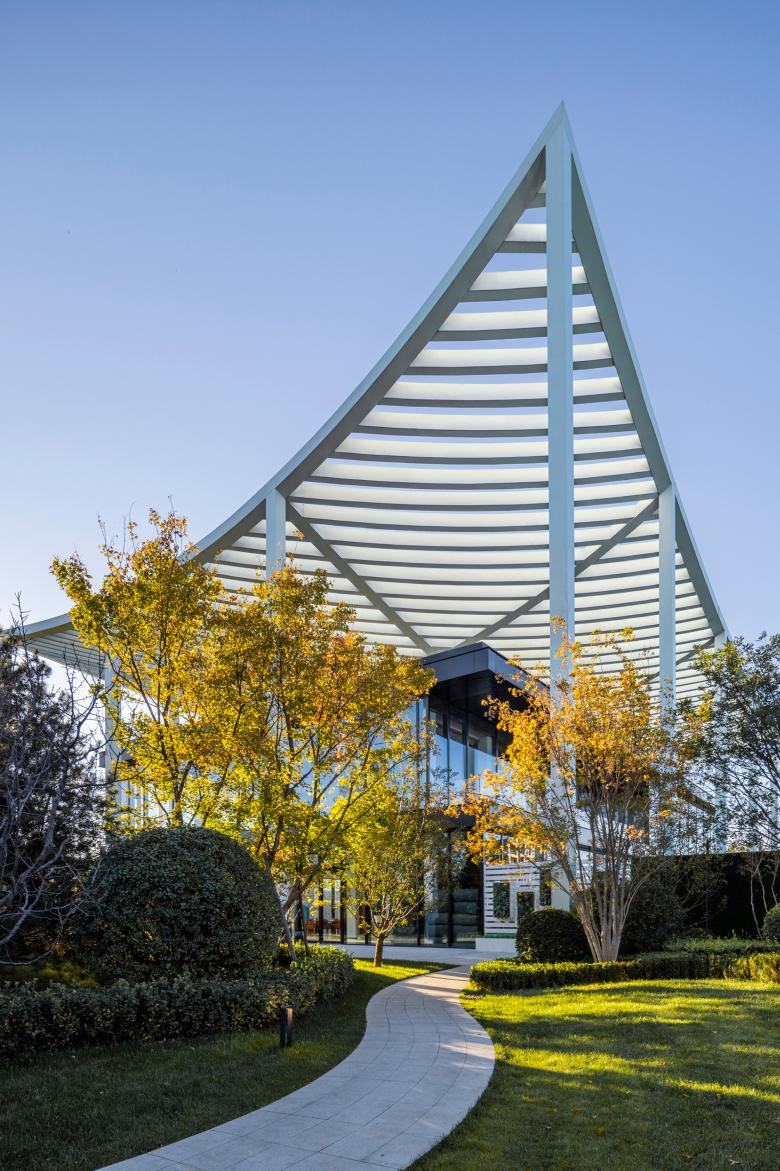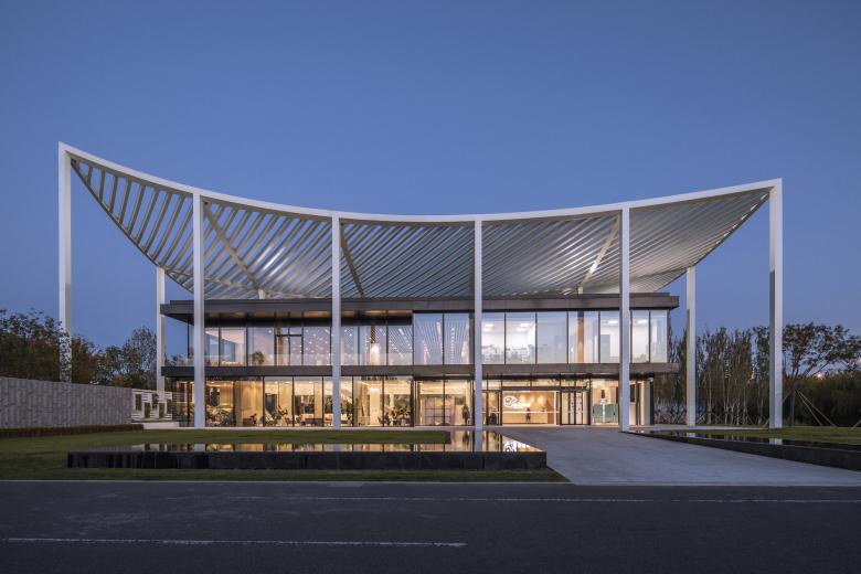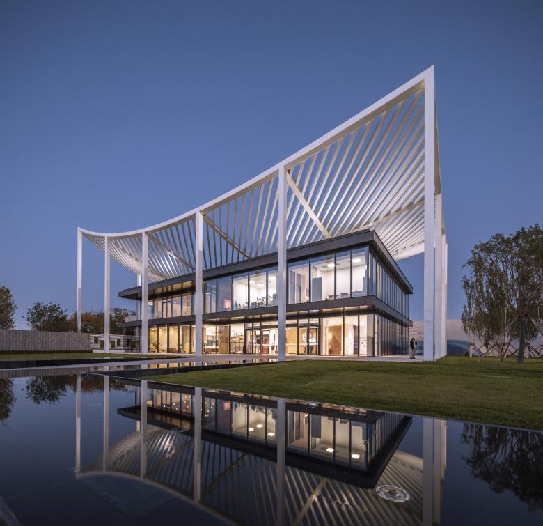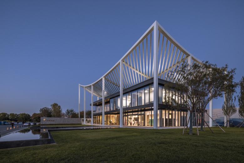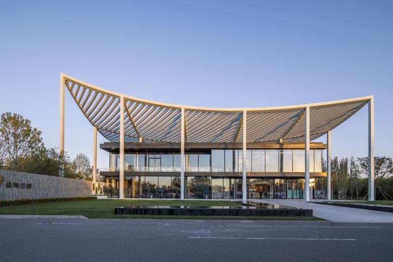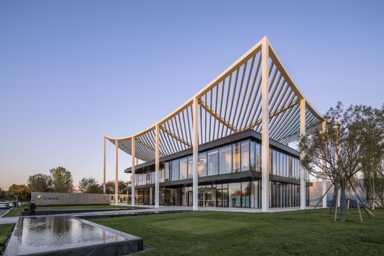 As uncomplicated and unpretentious as a piece of paper – that’s the canopy roof that defines the reception center in Bin Hai. The upswept corners are a feature of ancient Chinese buildings and were believed to be auspicious, alongside their function in deflecting rainwater. The diagonal beams of the center’s roof form a mesh that references a forest canopy, sheltering the glass pavilion beneath with dappled shade like the branches of a tree.