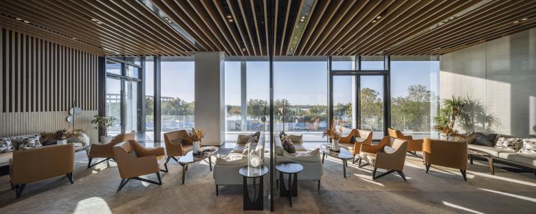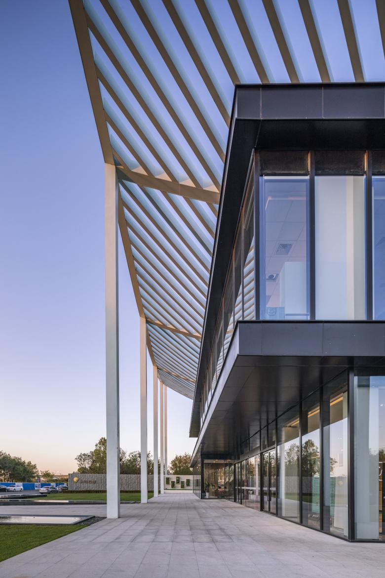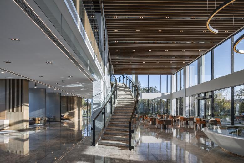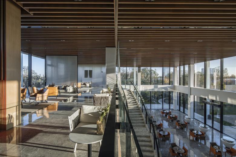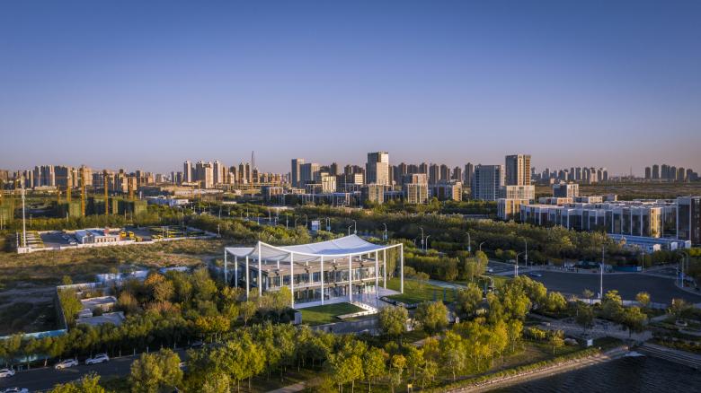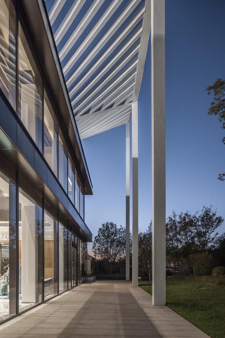 As uncomplicated and unpretentious as a piece of paper – that’s the canopy roof that defines the reception center in Bin Hai. The upswept corners are a feature of ancient Chinese buildings and were believed to be auspicious, alongside their function in deflecting rainwater. The diagonal beams of the center’s roof form a mesh that references a forest canopy, sheltering the glass pavilion beneath with dappled shade like the branches of a tree.