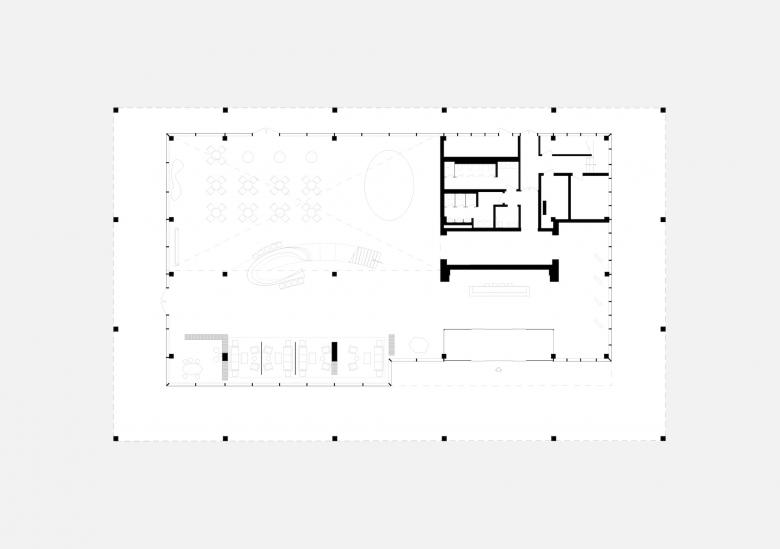 Standing on slender legs, the roof rises to 18.5 meters at its tallest point and extends over an area of 30 x 50 m – defining the outside deck some 5 meters beyond the perimeter of the pavilion. This gesture anchors the airy, transparent pavilion to the site. Inside the pavilion, a large atrium and the extensive views of the surrounding lake and gardens reinforce the open atmosphere and create a bright, welcoming space. The second floor includes offices and a viewing balcony, as well as seating areas for smaller and larger groups.