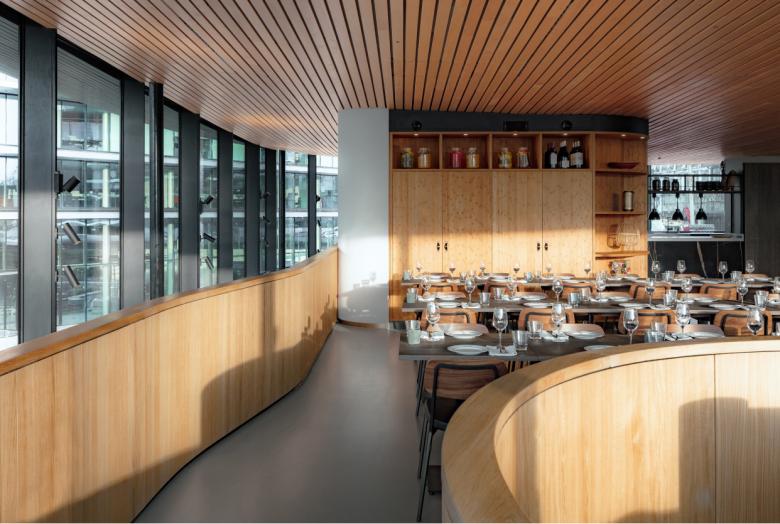 The pavilion, which meets high sustainability standards, owes its eye-catching appearance to a minimalist glass façade combined with a sculptural, freestanding wooden core. The separation of wooden core and glass façade – at no point do they touch each other – creates an airy and flowing interior space. The wooden ceiling and abundant greenery bring the outdoors indoors.