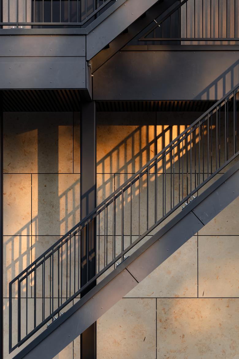The base of the building is clad in travertine, a characteristic post-war material that subtly references the neighborhood’s history. Above, demountable fiber cement panels in light brown and anthracite echo the timber structure both visually and functionally, while supporting long-term maintenance. Together, these materials enhance the building’s sustainable and circular identity.