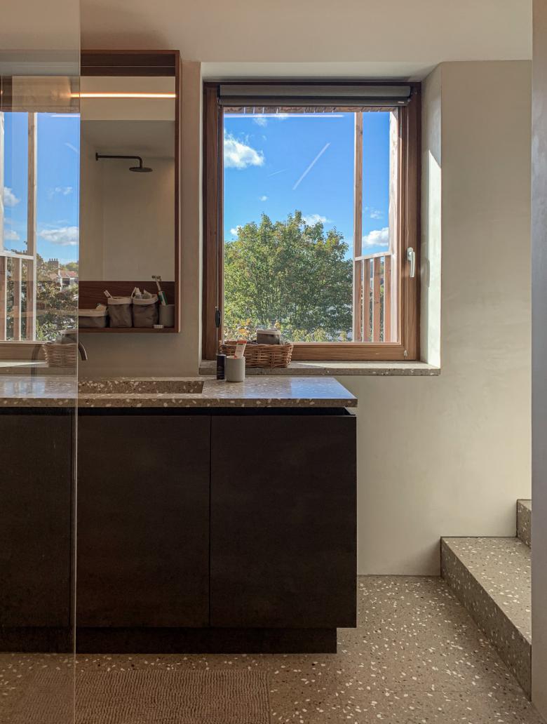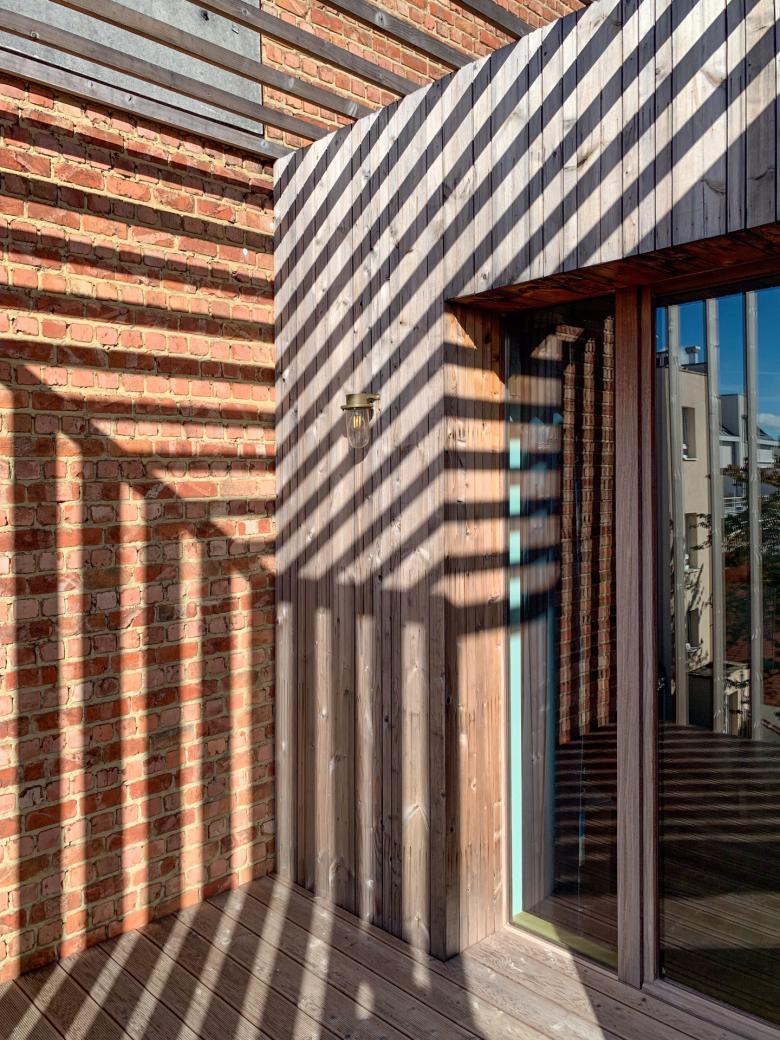 De integraal vernieuwde achtergevel contrasteert met zijn klassieke tegenhanger vooraan, maar biedt een extra nuance aan de ruwe plankenbekisting beton en eiken afwerking binnenin. Het buitenschrijnwerk, de bekleding en de verticale lamel - alles in hout - wisselen elkaar ritmisch af waardoor een gedifferentieerd gevelbeeld ontstaat. Een doordachte detaillering zorgt voor een zeer fijne afbakening van de nieuwe volumes