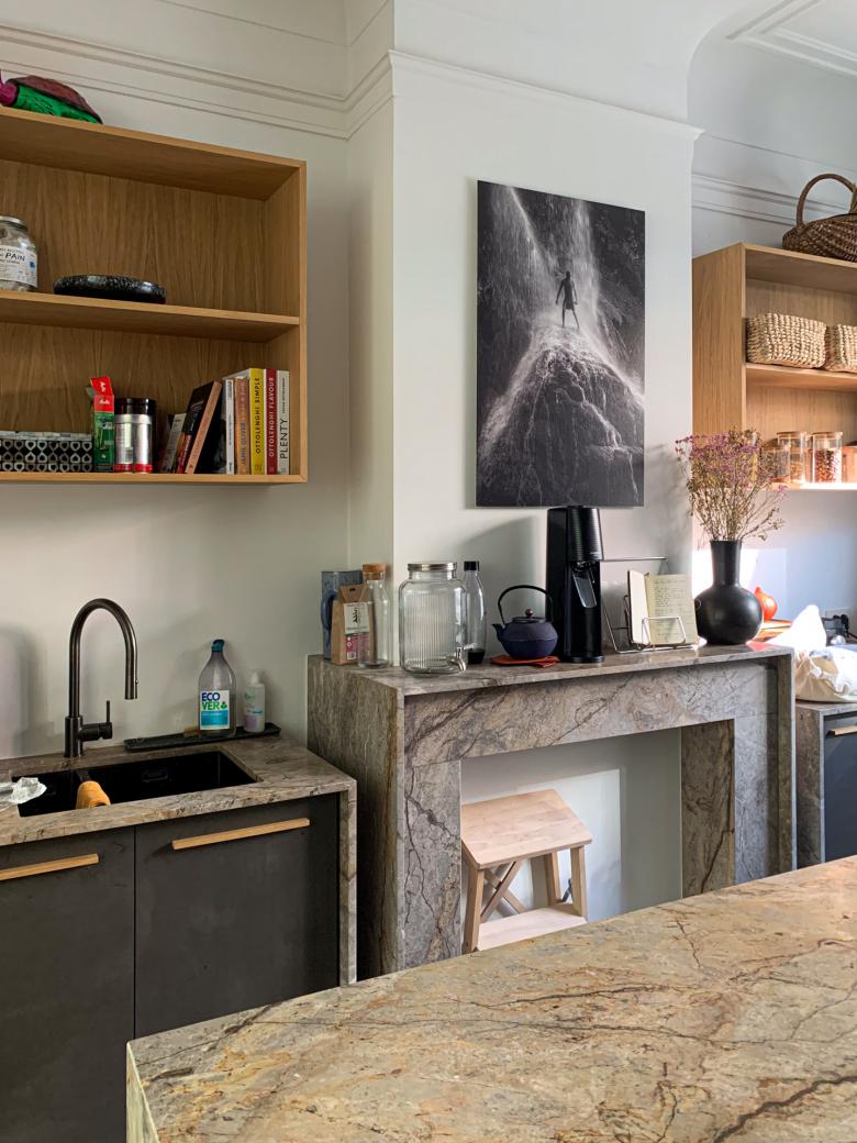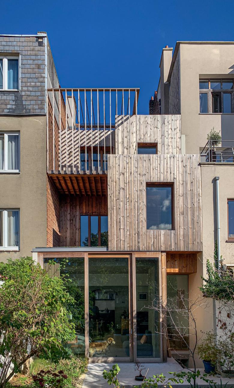 Deze klassieke burgerwoning in een levendige buurt van Brussel was aan een grondige herziening toe om aan de noden en het comfort van dit jonge gezin te voldoen. Een esthetische gevel met veel kwaliteiten, een degelijke indeling en een nogal chaotische achtergevel waren het gegeven, meer ruimte en natuurlijk licht was de vraag. Het resultaat is een open aanbouw waarin de klassieke elementen door een aantal eigentijdse ingrepen zijn aangescherpt.