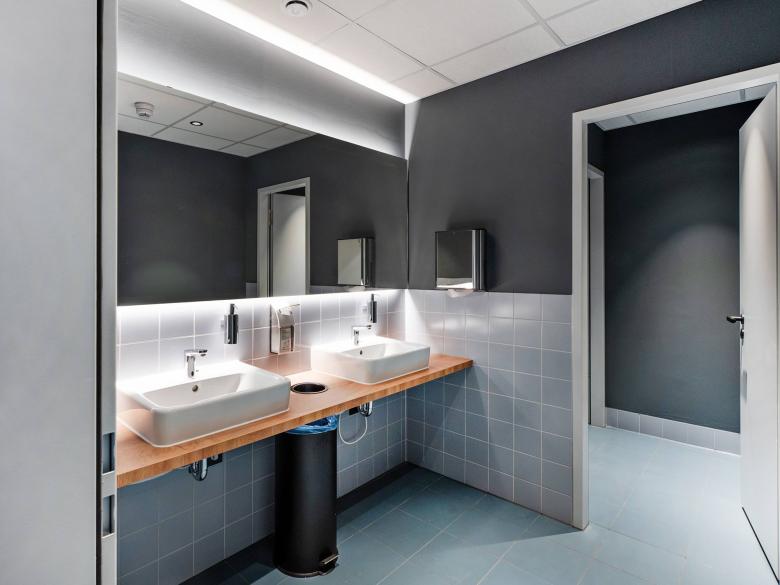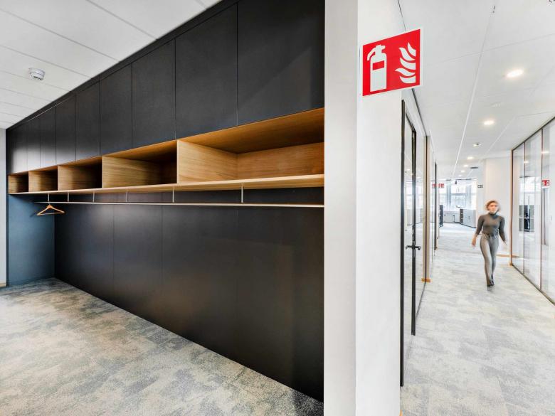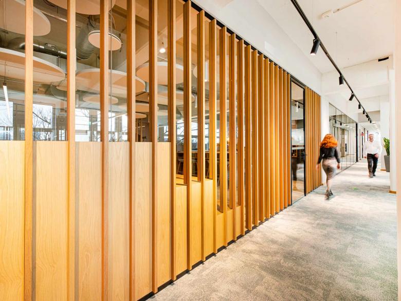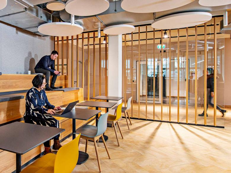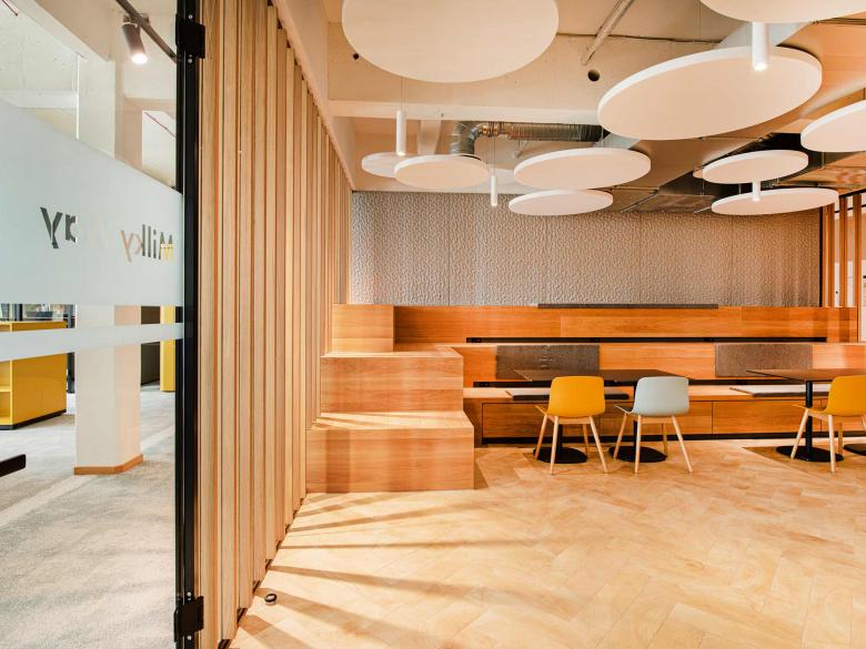 An der Neugestaltung der IT-Abteilung war Lindner als Generalunternehmer mit einer Vielzahl an Ausbauleistungen beteiligt: Neben Trockenbauarbeiten gehörten dazu auch die Herstellung, Lieferung und Montage von Deckensegeln, Glastrennwandsystemen und Türen. Dank individueller Gestaltung fügen sich diese optimal in die Büroflächen ein. Auch die Garderobe und der Ausbau der Sanitäranlagen sowie weitere Tischler-, Maler- und Bodenbelagsarbeiten stammen von Lindner. Drei unterschiedliche „Telefonzellen“ ermöglichen den Mitarbeiterinnen und Mitarbeitern den Rückzug in eine ungestörte Arbeitsumgebung. In diesem Zusammenhang entwickelte Lindner in Kooperation mit Carpet Concept und GiB innovative Bautechnologie mbH einen eigenen CAS Room – dieser wurde genau auf die Anforderungen der Fielmann AG zugeschnitten und bietet Raum für Konzentration und Kreativität. Darüber hinaus zeigen Studien, dass regelmäßige Pausen die Konzentration und Leistungsfähigkeit steigern: Deshalb ist das Herzstück der neuen Büroflächen der Aufenthaltsraum mit Küche und einer Sitztreppe aus Eiche. Mithilfe von Holzlamellen wird dieser von den offenen Arbeitsbereichen abgegrenzt.