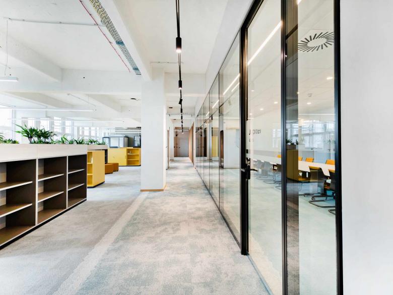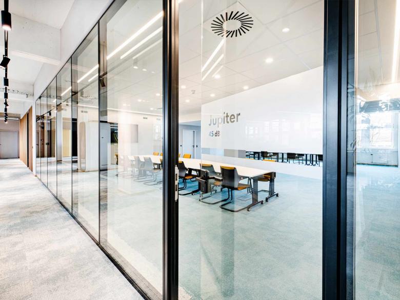 Die IT-Abteilung der Fielmann AG erstrahlt nun in einem neuen Licht: Abgeschlossene Räume in der Mitte des Großraumbüros ergänzen die klassischen Einzelarbeitsplätze – die Verwendung von raumhohen Lindner Glastrennwänden und Glastüren sorgt gleichzeitig für Transparenz und Diskretion. Zusätzliche Besprechungsräume, ein Kreativraum und Tafeln für Projektarbeiten fördern innovatives Denken und die Zusammenarbeit zwischen den Kolleginnen und Kollegen. Auch akustische Optimierung gewinnt immer mehr an Bedeutung: Daher wurden akustisch wirksame Deckensegel und runde Akustikelemente montiert.