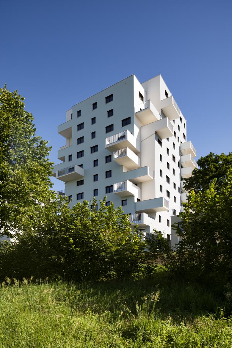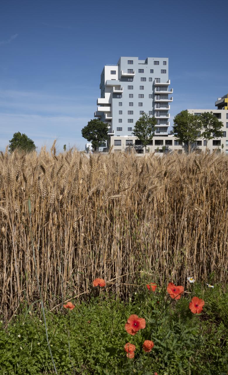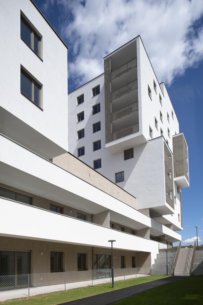 Die Bebauung folgt diesen Vorgaben und bildet räumliche Kanten und Hochpunkte. Der 35m Turm (Stiege 1) wird durch eine abgestufte Bebauung (Stiege 2) an der östlichen Kante in Szene gesetzt, die ihrerseits einen niedrigen Hochpunkt integriert. Diese beiden Bauteile umschließen mit der zum halböffentlichen Raum situierten Reihenhausbebauung einen introvertierten Eingangshof, von dem aus die beiden Bauteile erschlossen werden und der gleichzeitig einen kommunikativen Treffpunkt für die gesamte Bewohnerschaft darstellt. Von diesem zentralen Außenraum sind alle Gemeinschaftseinrichtungen, Fahrrad- und Kinderwagenabstellräume und Stiegenhäuser zugänglich.