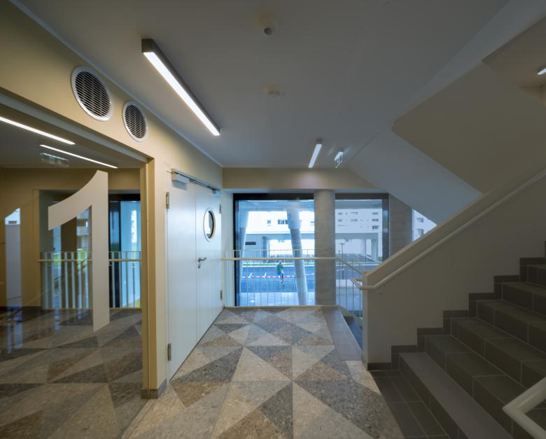 Die auf dem Bauplatz vorhandene Geländetopografie wird genutzt um die Funktions- und Technikräume in den Hang zu integrieren. Die belebten Erdgeschosszonen tragen somit ringsum zur Belebung der angrenzenden Räume und Aufenthaltsbereiche bei.