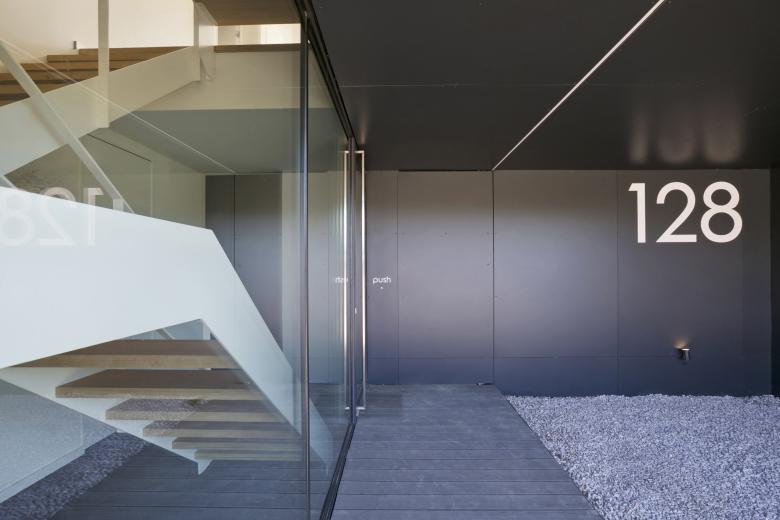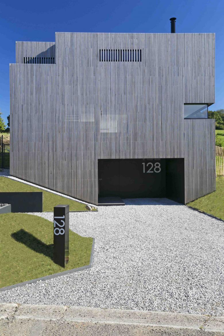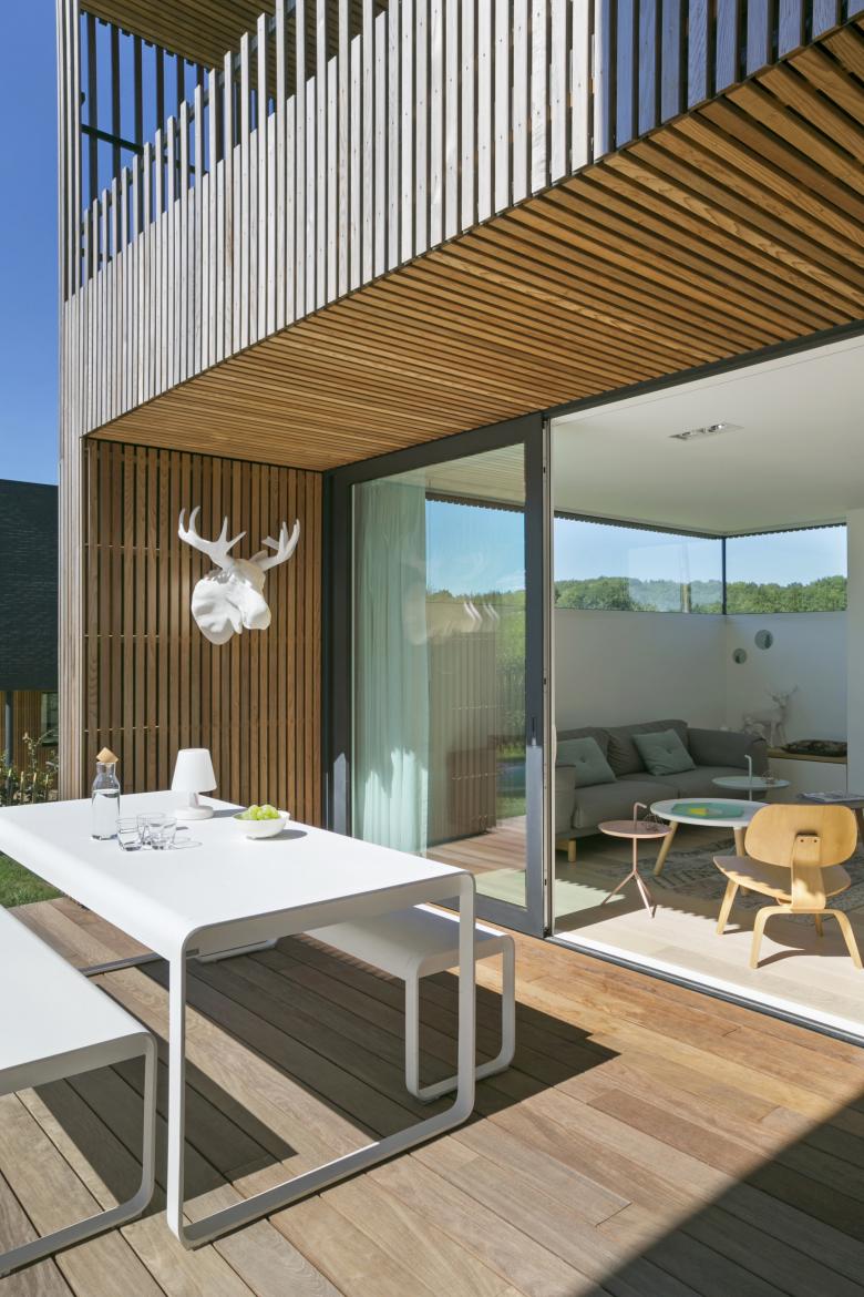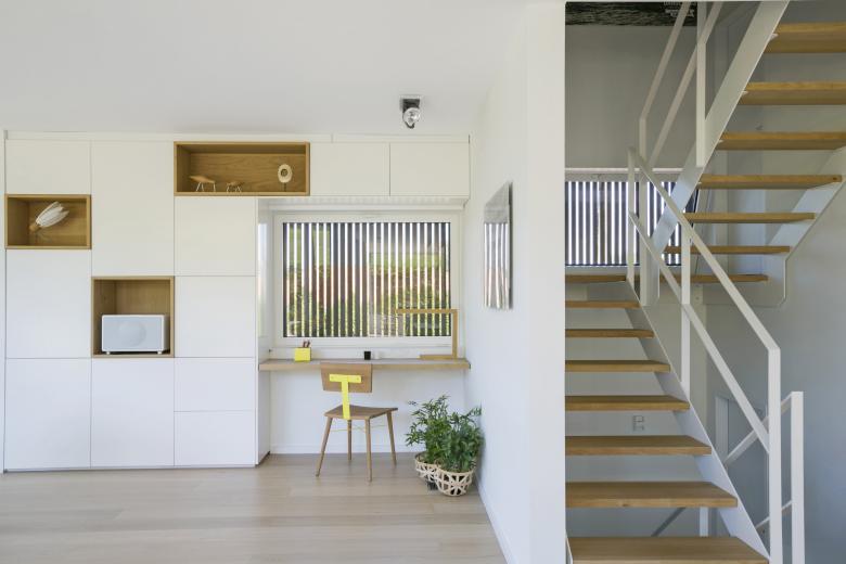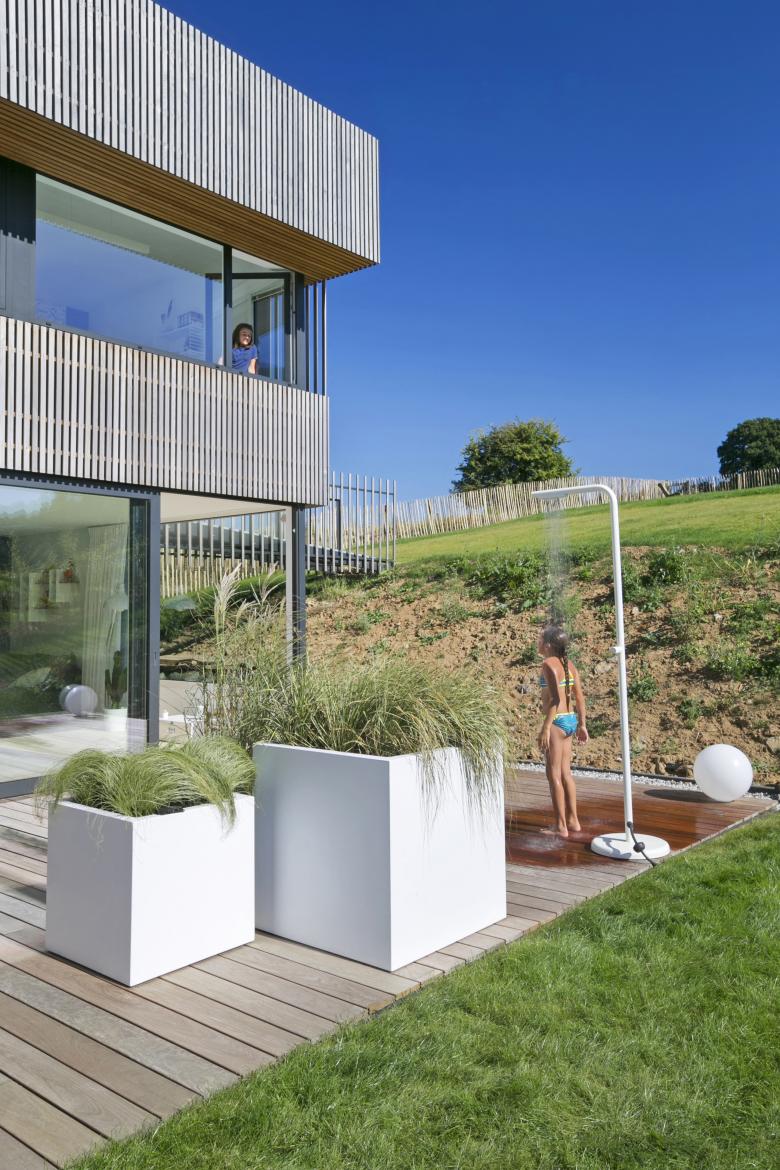 En encorbellement sur le rez, l'étage le protège des surchauffes et créée une zone extérieure couverte de circulation vers le jardin. L’aménagement des abords (à rue) permet l’emplacement de 2 à 3 places de parkings pour les visiteurs.