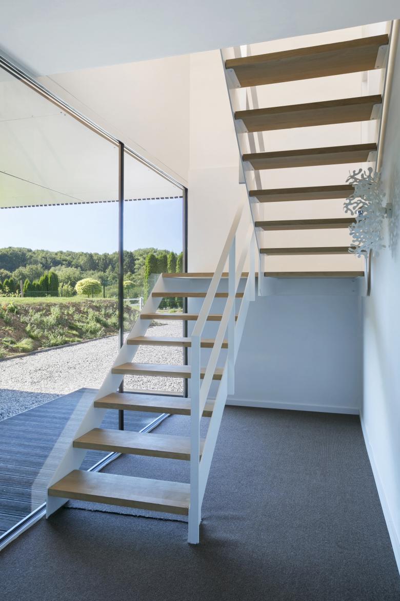 Vu la course du soleil située à l'arrière du terrain et la configuration de la parcelle en pente, le projet propose un concept différent d'un habitat traditionnel. L’entrée de l’habitation se réalise par un niveau semi-enterré en contact avec la voirie (entrée/vestiaire/cave/car-port une voiture/rangements vélos et jardin) et les espaces de vie se situent au premier étage (séjour/arrière cuisine/espace chiens/jeux pour les enfants). A l'étage, (espaces de nuit/dressings/salles d'eau) permet un accès à l'arrière du jardin par une passerelle légèrement en pente. Celle ci permet donc aux enfants d'accéder en direct au niveau du terrain. Les sanitaires au nombre de deux sont accessibles à partir de la cage d'escaliers à partir de chaque palier.