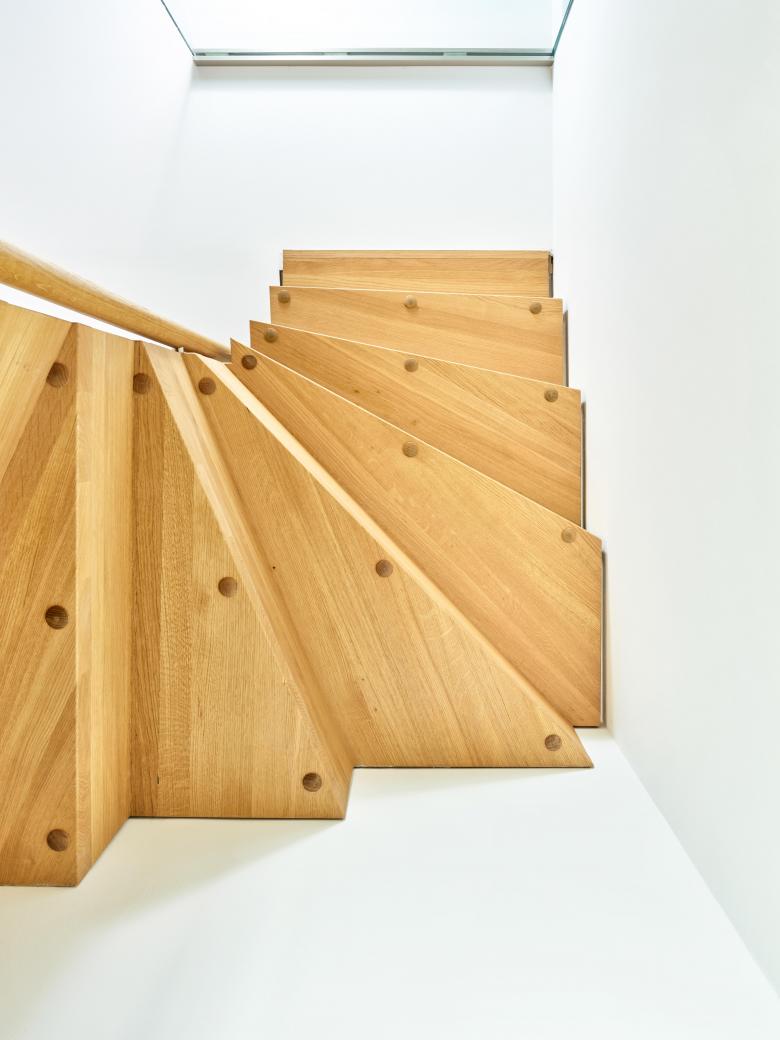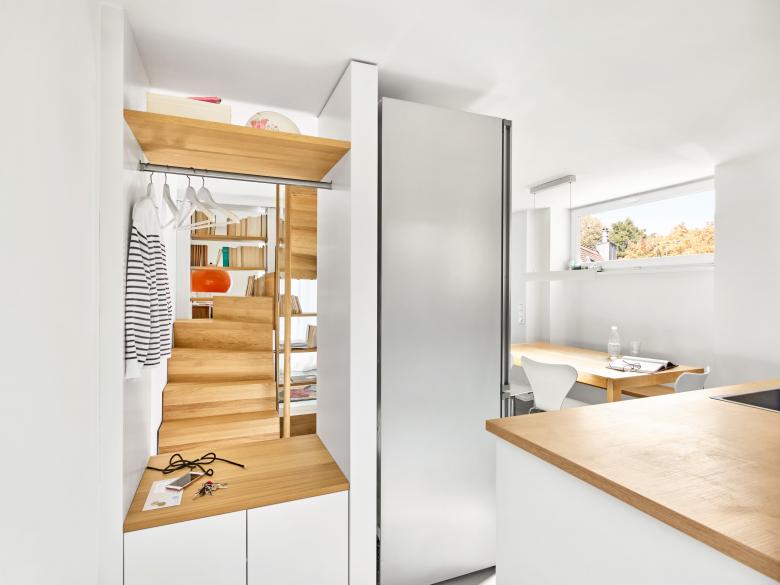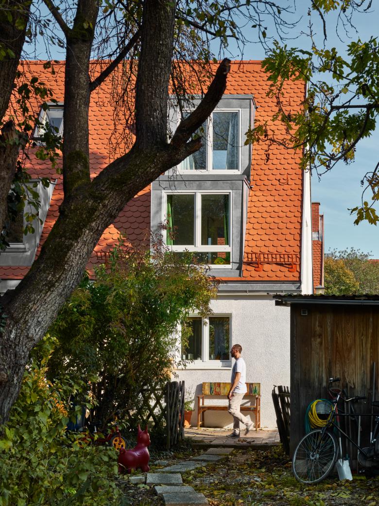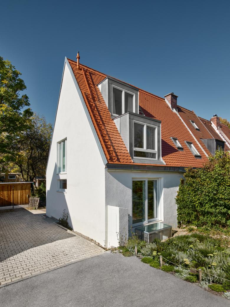 Complete renovation and space redesign of a compact end of terrace house in the 1930s 'May Beetle' settlement in Munich, Germany. sophiegreen was comissioned by the clients (a family with two children) to add livable space and maximise light in this 1 bedroom property while staying in accordance with the ideals that the garden city was built in: a living environment characterized by usable open spaces - a private garden opposite the house accessed through an open living area.
