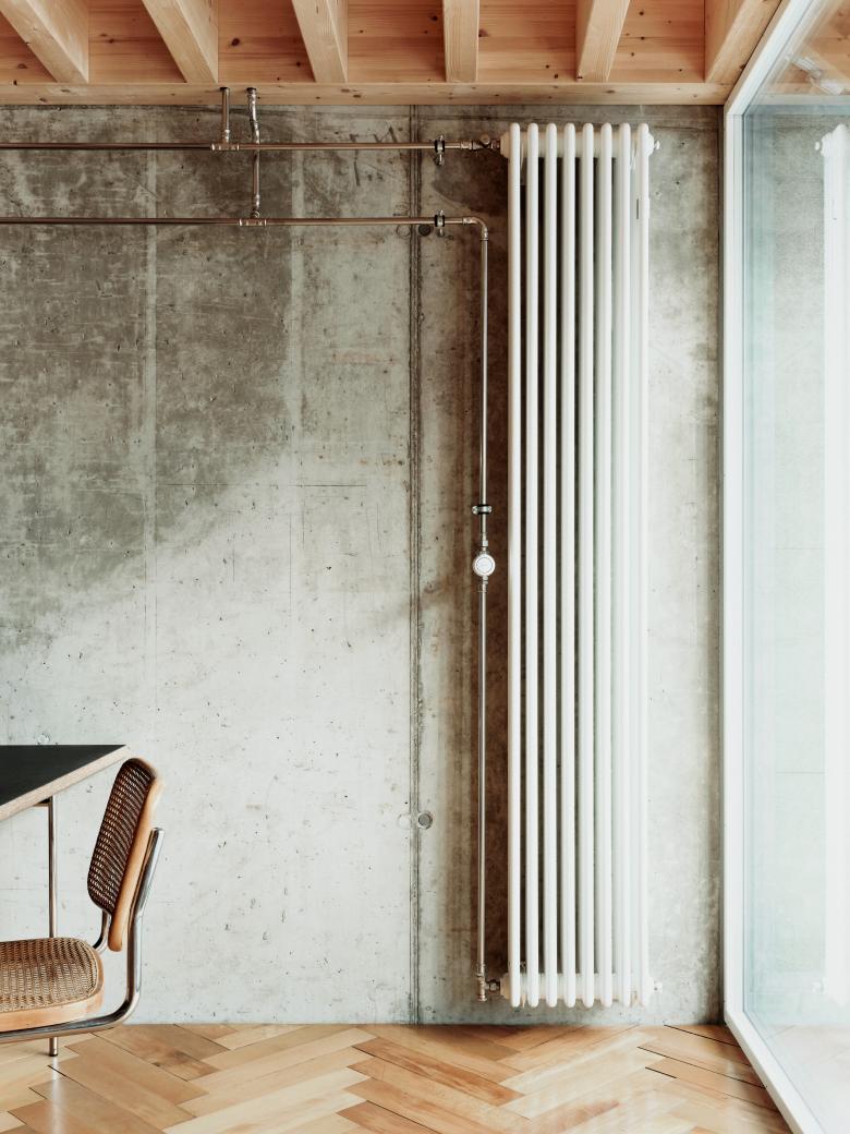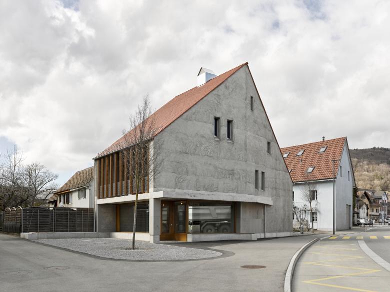 Das Haus zum Pudel entstand auch aus dem Willen, ein Stück Dorf zu entwickeln und eine identifizierbare architektonische Haltung aufzuzeigen. An prominenter Lage, wurde ein Stück Dorf reanimiert. Anstelle des 60-jährigen Kiosk-Provisoriums mit Bushaltestelle und einem verschachtelten, kaum bewohnbaren Wohnhaus, steht nun ein markantes Volumen. Dieses folgt mit einem Knick dem Strassenraum. Rückseitig wird auf die bestehende, nachbarschaftliche Liegenschaft Bezug genommen. Der zur Liegenschaft gehörende Aussenraum ist gleichzeitig öffentlicher Raum.