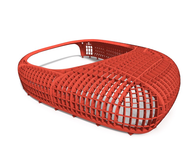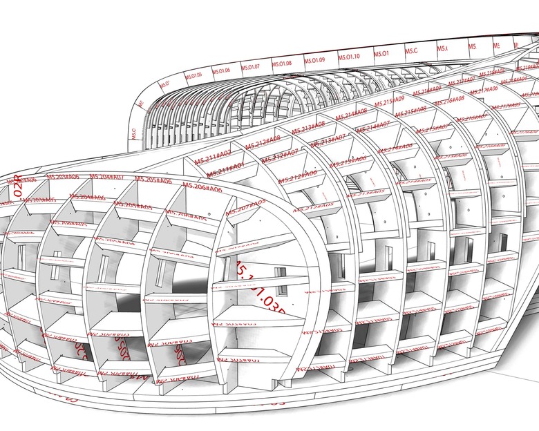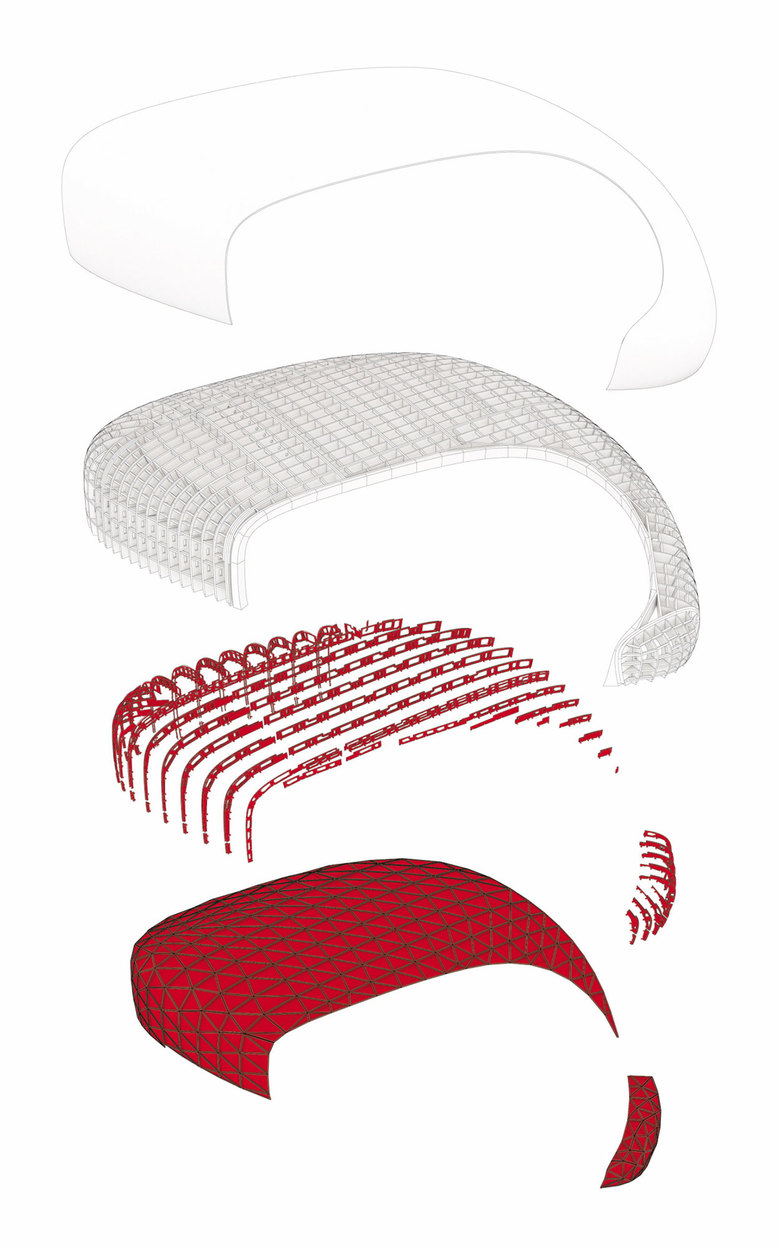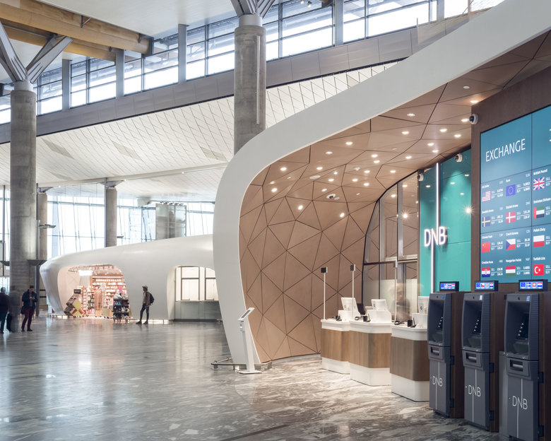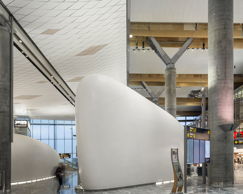 Die Lindner AG konnte bei diesem Bauvorhaben ihre Stärke bei komplexen Sonderlösungen voll einbringen: Zusammen mit dem Bauherrn Avinor und dem ausführenden Architekturbüro Nordic erhielt Lindner den Zuschlag, fünf individuell geformte Pavillons zu entwickeln, zu planen und unter laufendem Flughafenbetrieb zu montieren. Für die frei geformten Geometrien empfahl Lindner, von der ursprünglich geplanten Bauweise mit Stahlelemente auf den leichteren Werkstoff Holz zu wechseln und so in Folge auch den logistischen Aufwand zu vereinfachen. Die komplette Tragstruktur wurde in einer detaillierten 3D-Planung als Spanten-Konstruktion aus Brettschichtholz ausgeführt. Daraus entstanden 10.000 individuell gefräste Einzelteile mit entsprechender Nummerierung für die exakte und schnelle Montage vor Ort. Mit diesem Aufbau konnte Lindner die gewünschten Längen, Breiten sowie Höhen nach statischen Anforderungen realisieren. Die organische Form sowie die geforderte Brandschutzklasse der Pavillons realisierte man mit einer mehrlagigen konvexen Beplankung mit biegbaren Gipskartonplatten. Die sichtbare Außenhaut ist mit einem mineralischen Kalkputz, deren Struktur und Farbe nach mehreren Workshops mit den Architekten gewählten wurde, veredelt.