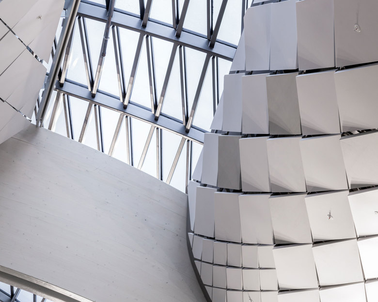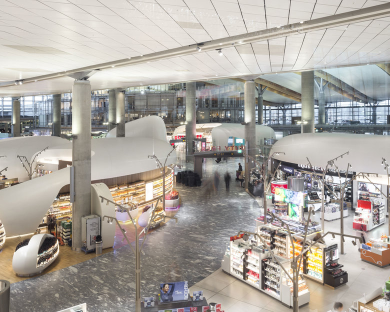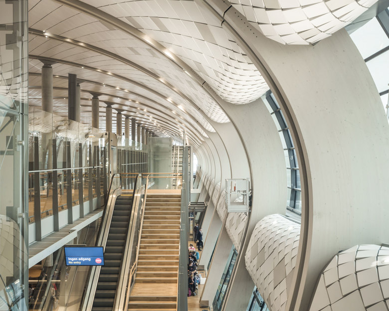 Die Innenseite verkleideten die Monteure mit dreieckigen, akustisch wirksamen Metallpaneelen. Aufgrund der unregelmäßigen Formen innerhalb der Baukörper ist jede der ca. 8.000 Paneele ein Unikat. Auch die Unterkonstruktion musste speziell für dieses Projekt entwickelt werden. Die Pavillons, deren äußere Gestalt nordische Felsen darstellen, beherbergen mittlerweile einen Duty Free Shop, Buchladen, Bankfiliale, Bäckerei sowie ein Geschäft für Damenmode.