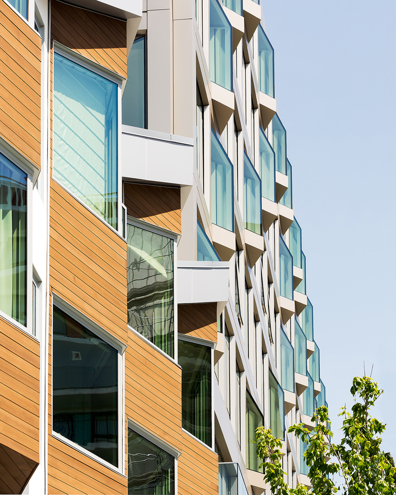 With pitched rooflines and angular bay windows, the townhouses are clearly part of the larger complex yet offer a home-like experience with larger spaces and more privacy. The exterior facades are composed of red cedar siding combined with Swiss Pearl cementitious panels and silvery glass that is lined in a brushed aluminum trim.
