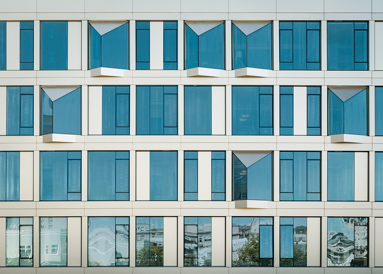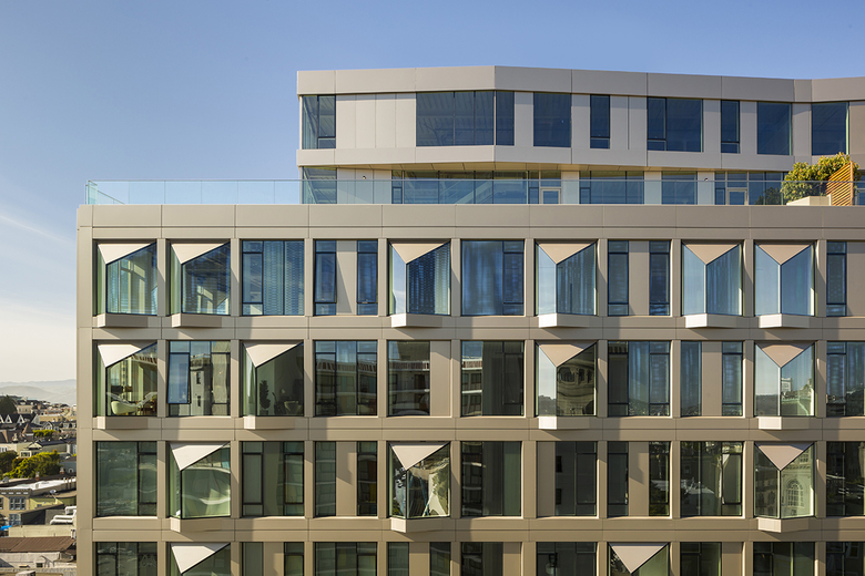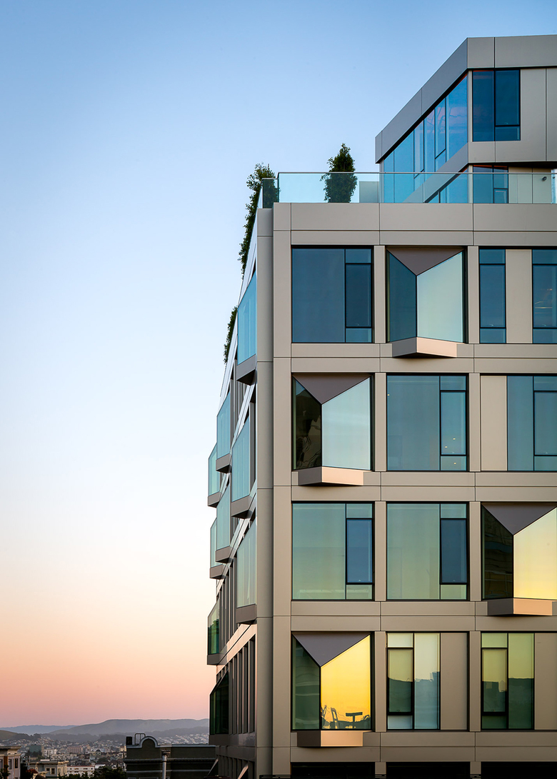 The original building was essentially built like a hospital, with high ceilings and large floorplates, which translated well to a residential building. The heavy precast concrete façade was removed and replaced with a window wall system composed of champagne colored metal panels and floor-to-ceiling glass. Window openings were made much larger, such that they are now the dominant feature in the façade. Additionally, triangular bays that are as tall as the windows extend past the building face, so that each apartment can actually look down onto the streetscape below. These “glass apertures” create a strong geometric presence and textural quality, while breaking up the building’s mass.