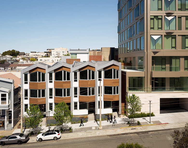 Next door, a series of ten modern townhouses were designed to relate in scale to the Victorian houses throughout the neighborhood, while visually tying to the main building through their geometric facades and materials.