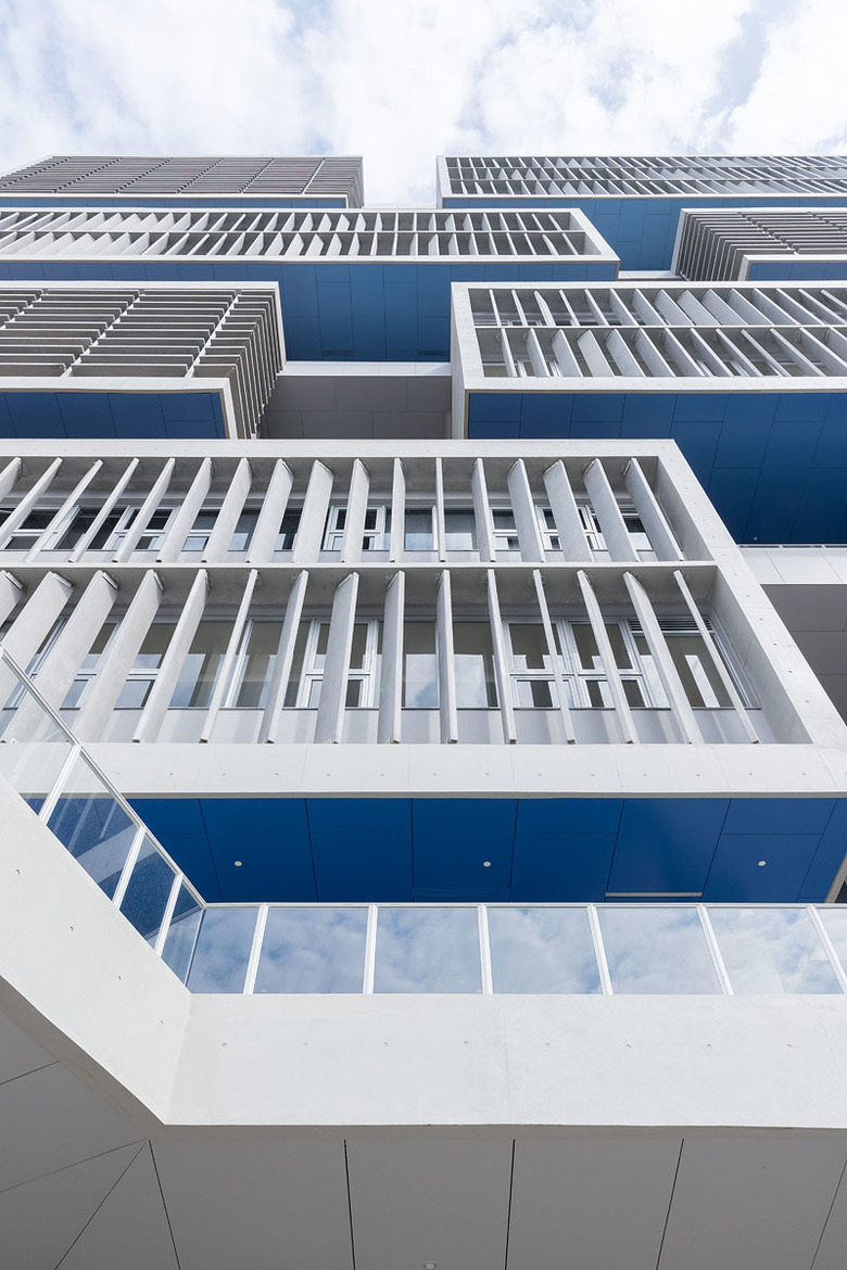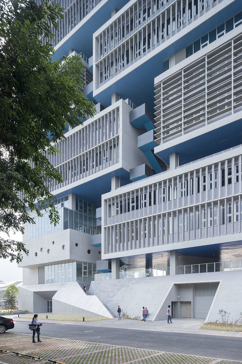 The architectural language of the building is born out of the local climate of Shenzhen. Abundant semi-outdoor spaces regulate the micro-climate of the building, while the thin-slab typology maximizes the potential of natural ventilation. Densely and carefully placed exterior shading device efficiently cut down the heat gain, yet still offers good views for the lab and offices. Passive strategies are adopted whenever possible to lower the energy consumption. Exposed structural concrete provides a long-lasting and maintenance free exterior finish, in direct contrast with its stucco-ed neighbors.