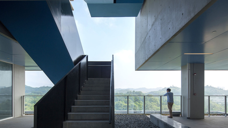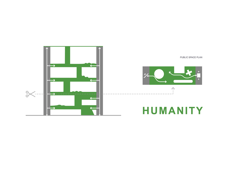 The design takes the organization of public spaces within the overall campus as a starting point. Instead of terminating the campus' main axis on the plan, the building folds the axis to extend it upwards, with abundant public spaces injected along the way. The conventional quad typology for university campuses is re-interpreted here, to form a lively vertical quad system. Meanwhile, the semi-autonomous yet interdependent relationship among the research centers can be visualized in this vertical campus - a shared public level is sandwiched in between every two research centers. Conference room, brain-storming area, exhibition space, study rooms, cafés and other facilities can all be found in these shared levels. Furthermore, within each research center, the labs and offices are separated by a vertical gap, with stairs connecting different horizontal and vertical public spaces together. As time goes by, the plants in these shared spaces will flourish and extend the greenery on the ground all the way up to the roof garden at 60-meter high. The roof garden has a small open air theater which will be a very special panorama viewing platform in the campus, where one may not only enjoy the views of distant mountains and changes of the sky, but also glimpses of giraffes in Shenzhen Wildlife Zoo not too far away.