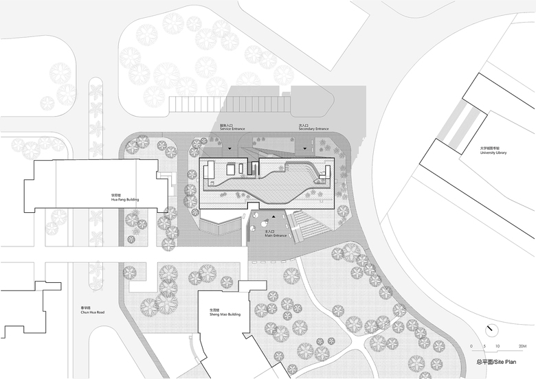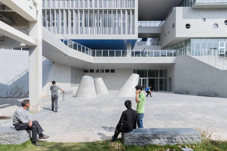 Instant university towns are recent Chinese urbanization in epitome: far away from city centers, these isolated urban archipelagos are often over scaled, lack of humanistic concern and its related services. With the opportunity of designing Ocean Center, the last building on this campus, we hope the new building will participate in the campus life with a brand-new attitude and present possibilities that rarely existed before. This is a building with an open and welcoming atmosphere, while the injected public spaces encourage all the staff and students to participate and socialize; It is a building where intelligent brains may encounter each other and inter-disciplinary communication happens naturally.